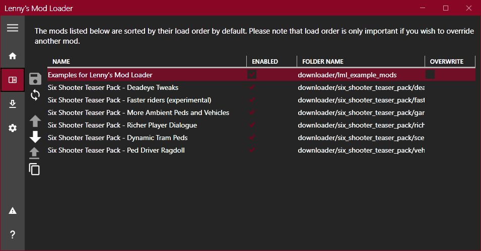 Author: LMSOriginal address: https://www.rdr2mods.com/downloads/rdr2/tools/76-lennys-mod-loader-rdr/Lenny's Mod Loader (LML for short) is a Mod Manager developed by LSM for "Red Dead Redemption 2". It can modify any files in the game without moving the original files of the game, such as model files, Texture files, data files, font files, etc.### installation method:-Copy all files in the `ModLoader` folder to the game directory, make sure that the `vfs.asi` file and `RDR2.exe` are in the same directory-`Mod Manager` folder can be unzipped to any directory### supportThe biggest feature of this tool is to support the editing of ymt files, even if the original file contains unknown hash values.If you need to replace the file, you need to use OpenIV to export the ymt to xml, and then replace the original file by installing.xml or replacing the file. Since you are replacing the ymt file, make sure that your file also has the ymt extension, even if it contains xml.For the replace folder method, you also need to match the file name. Now you can edit the file in plain text, the game will treat it as a ymt, and all names will be automatically fixed when loaded. For more information, see the included sample files.If you eventually find a file and you feel that it has not been properly repaired by LML (for example, exporting the file directly from OpenIV without making any changes will break the game), please let me know. I know that the only file that causes problems at the moment is weapons.ymt, but this is not due to LML, but because of an export error in OpenIV that cuts off certain weapon flags. The High-Roller revolver example manually restored these flags, so it works fine, but this is not the case when exporting directly from OpenIV. I have notified the team and believe that they will resolve this export issue in the future. Before that, if you intend to use them, you will have to manually check the ymt, collect the flags and restore them manually in the weapon’s xml. Please note that this requires advanced knowledge of game structure.### Ymt exampleThe compressed package contains a large number of examples, which are all made by [@Modifiver](https://www.rdr2mods.com/profile/5894-modifiver/ "@Modifiver").Demonstrated the modification of all aspects of the game.View them in the included sample folder and copy them to your lml folder to try it out!### Upgrade from the old version of LMLThis version of Lenny’s Mod Loader introduces the install.xml file to instruct LML how to load your mod. Therefore, the modules can be separated in folders, and the nested folder structure is no longer needed. This is a proven concept in our version of GTA V and has now been ported. You can still use the replacement and flow folders under the lml folder. But please note that Mod Manager UI will only select modules that use the new install.xml system, so it is recommended to convert your modules to the new system. Only modules using install.xml support downloading using the module manager. Please refer to the example below to learn how to use the new system.### Example ModYou can find more examples of [@Modifiver](https://www.rdr2mods.com/profile/5894-modifiver/ "@Modifiver") here:https://www.rdr2mods.com/downloads/rdr2/mods/80-modifivers-six-shooter-teaser-pack/More examples of detailed documentation on the new install.xml system can be found here:https://www.rdr2mods.com/downloads/rdr2/mods/77-examples-for-lennys-mod-loader/### Verify your file got replacedIf you feel that your file is not being replaced properly, have a look at the log file and see if you can find any entry related to it. Perhaps the path was not correct and hence it did not work. Search for "replaced" for files in replace and "adding" for files in stream.### SupportSince this is the first release for RDR I expect there to be quite a few problems and certain files might not work as expected. If you have trouble replacing specific files, please do not hesitate to comment here or reach out and include your modified file and file structure so I can have a look.### Installation videoBy [Gan Ceann](https://www.rdr2mods.com/profile/8-gan-ceann/ "Gan Ceann") at YouTube[video]https://www.youtube.com/watch?v=E-OIFFcIKDs[/video]