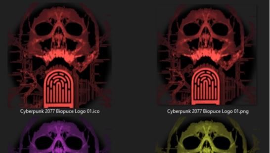 Biochip icons in cyberpunk colors: yellow, red and purple.