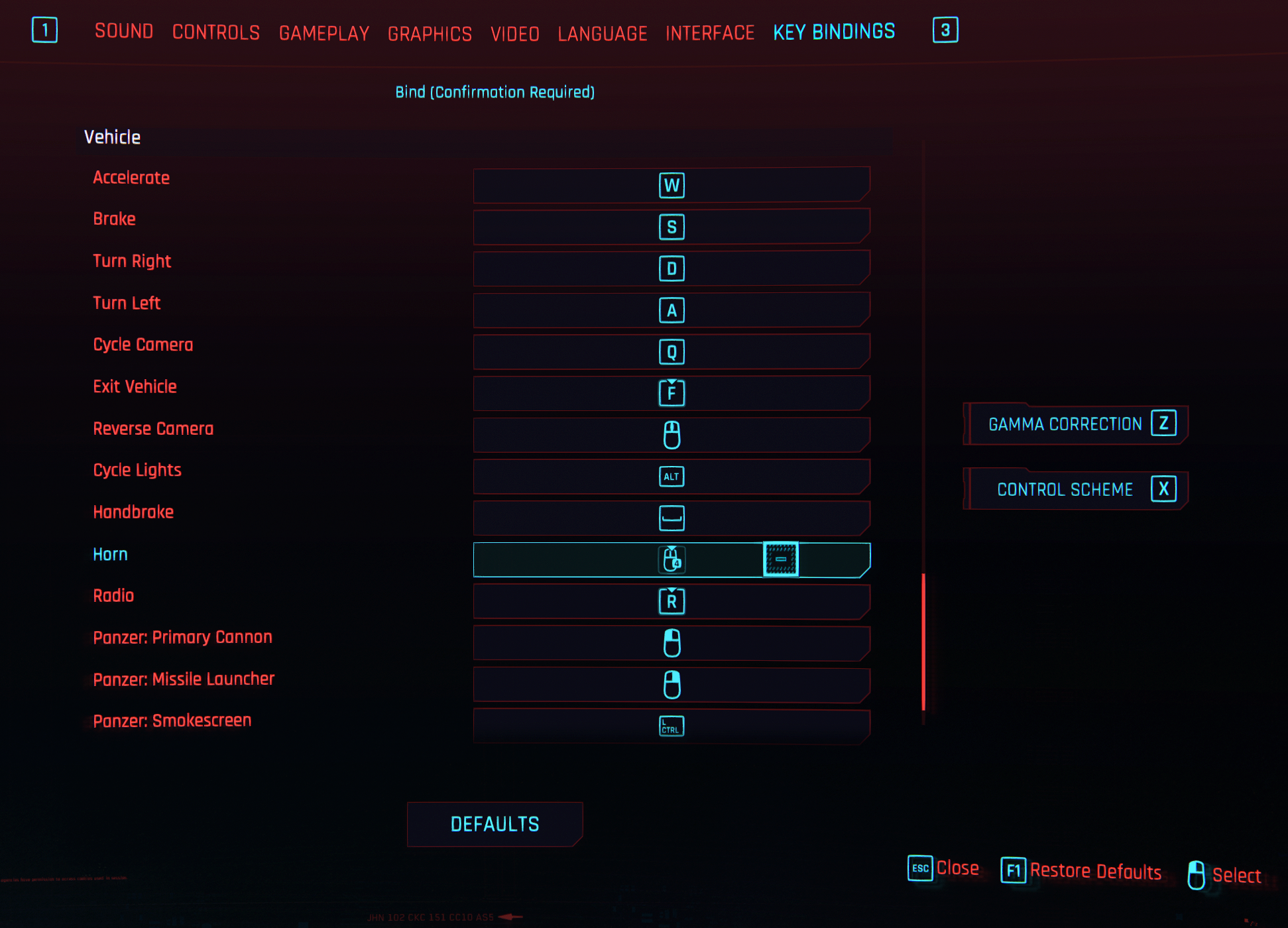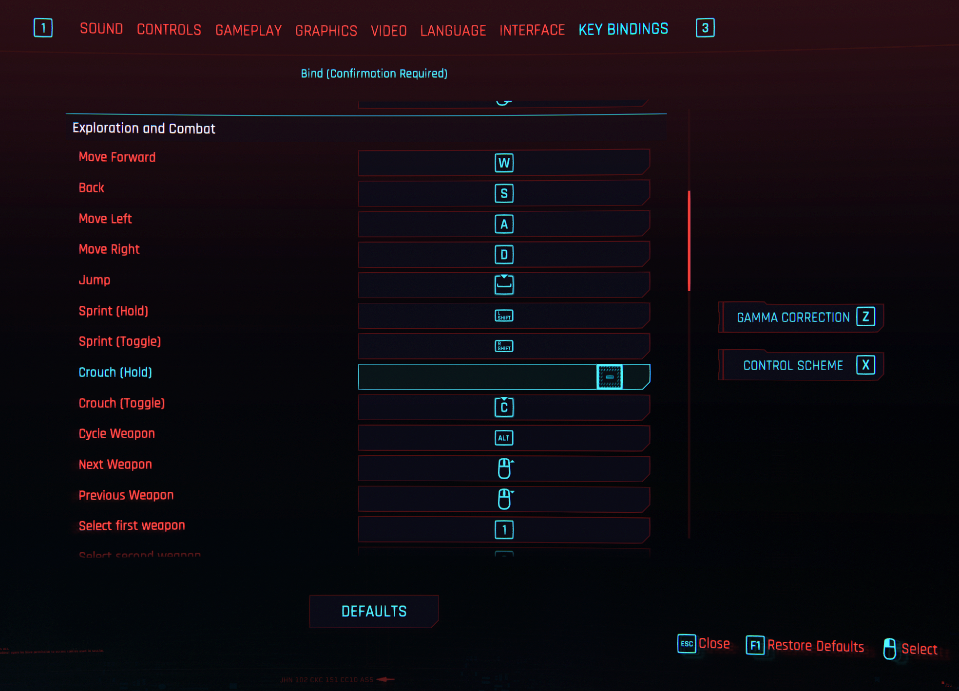 Left Ctrl + move key = walking (all directions). Left Ctrl = slow driving (independent). Disable the left Ctrl key for "crouch hold". Disable double-tap to move keys (W, A, S, D) to dodge, and add a separate dodge button. Enable the use of the up/down scroll wheel for dialog selection. Enable the space bar to confirm the dialog selection.