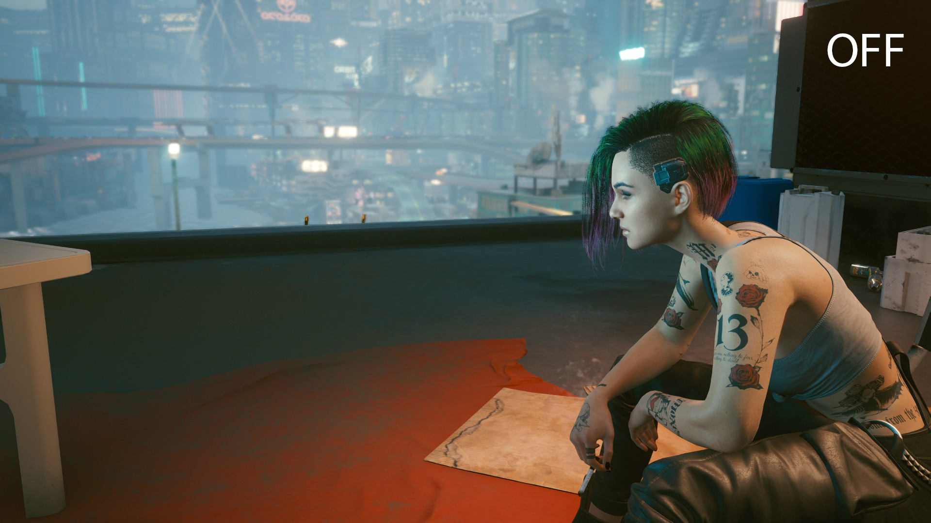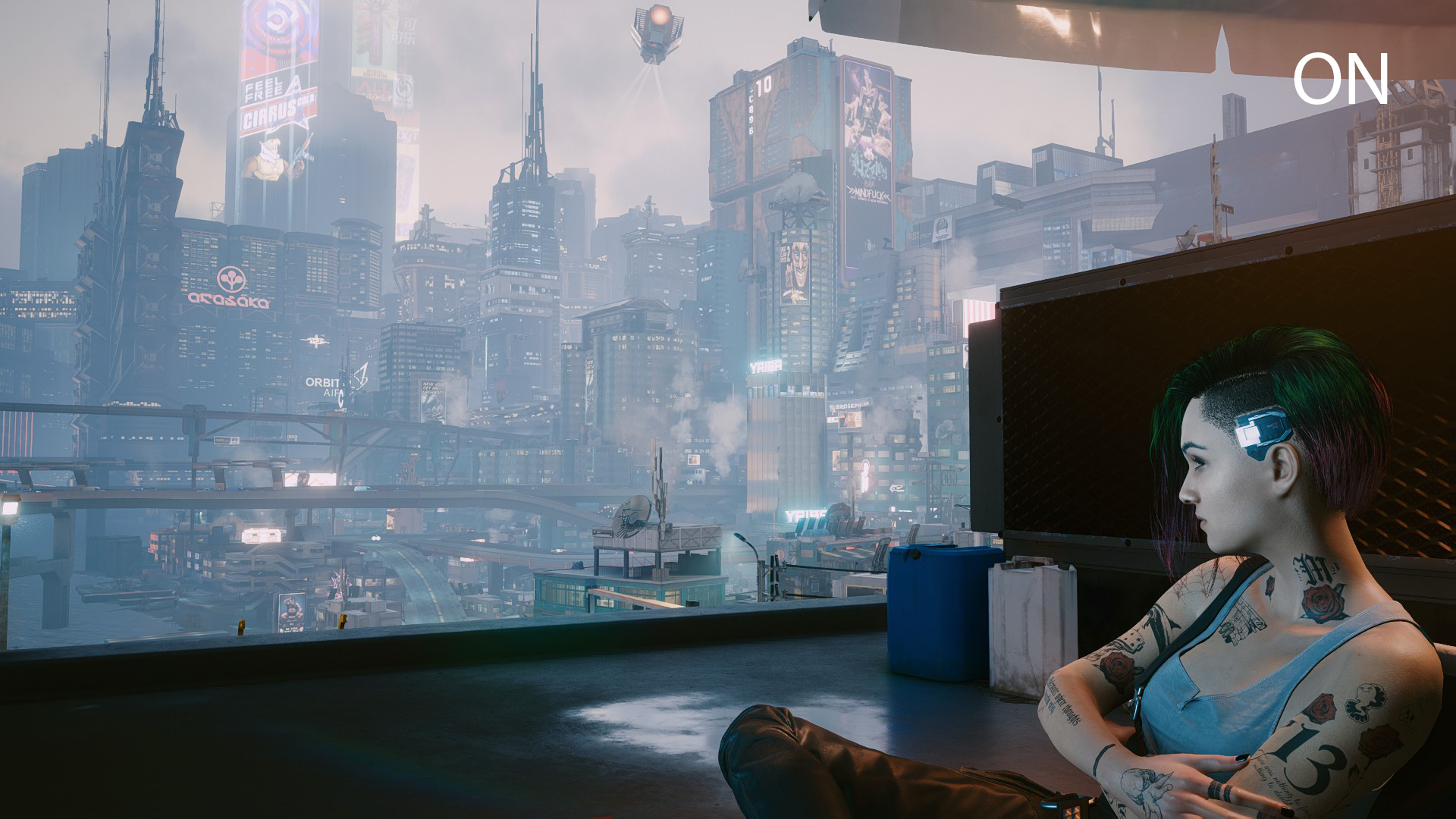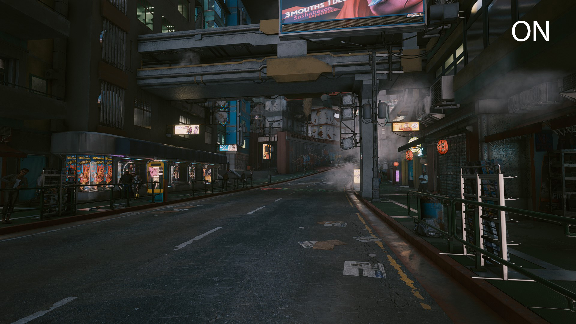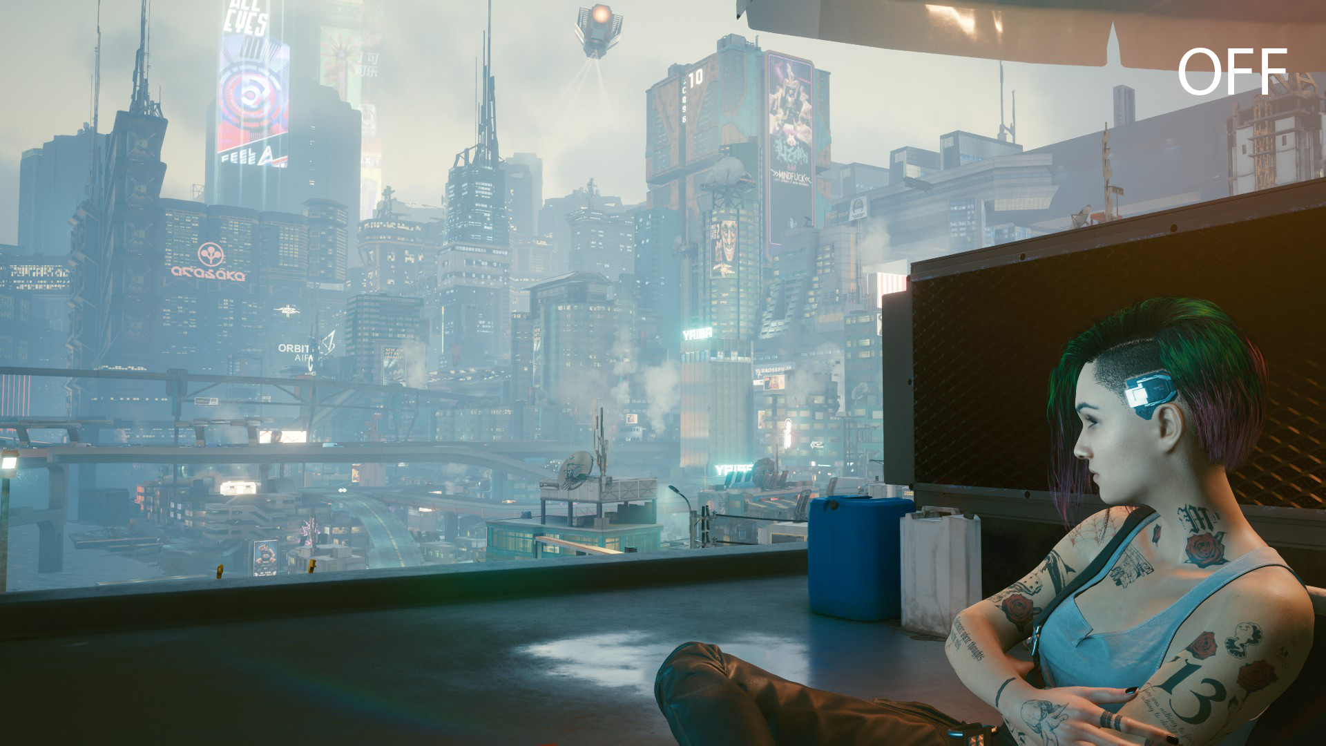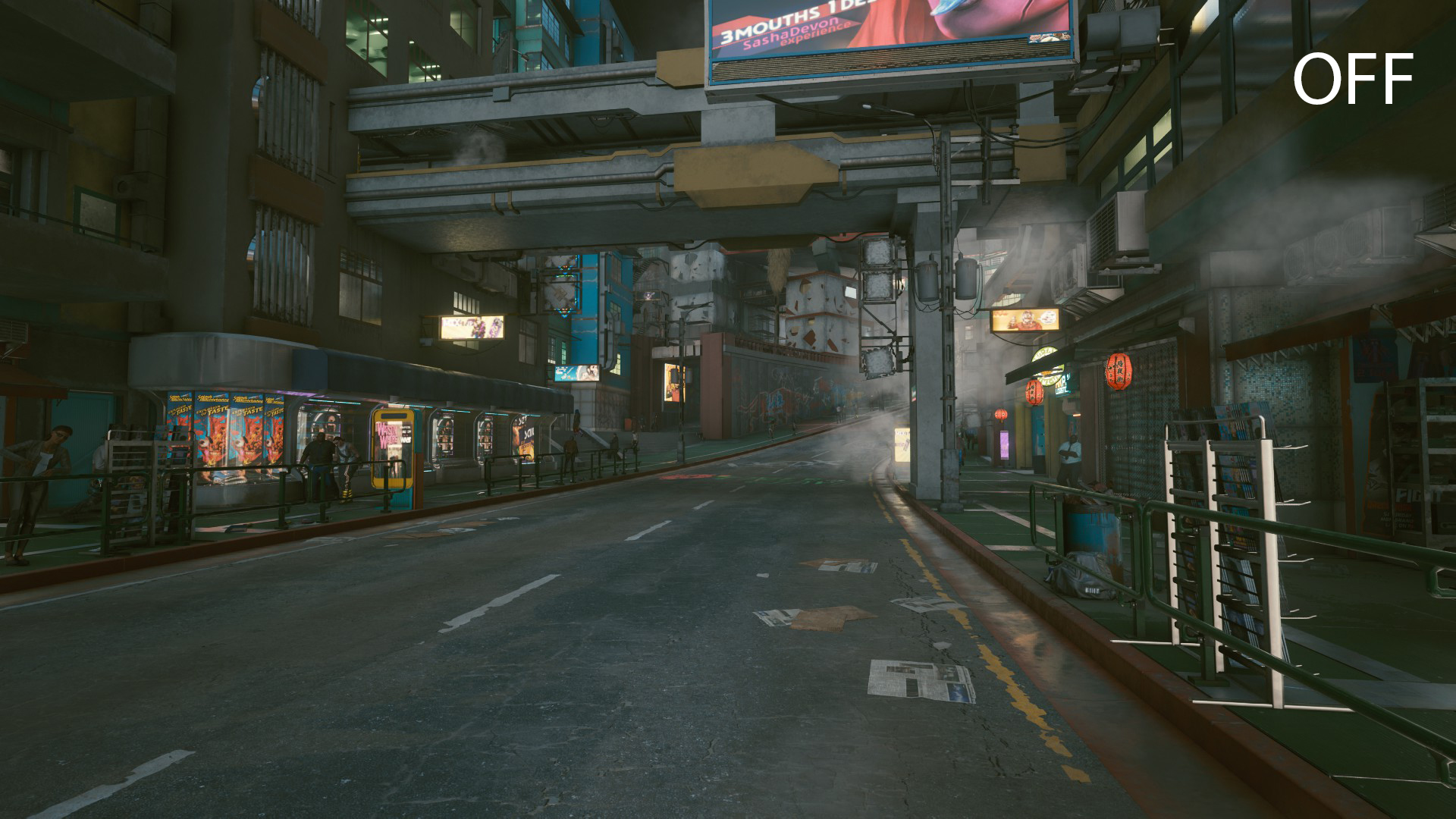 The simple ReShade eliminates the green color overlay, darkens the final image a bit, and makes Night City more realistic and gloomy.