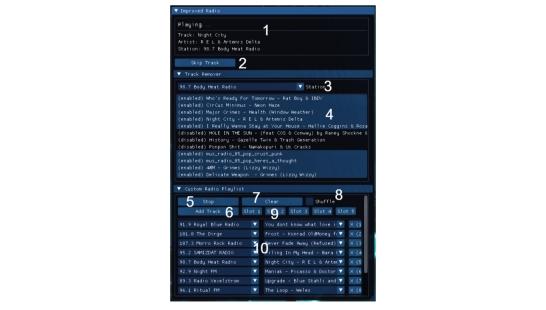 Allows full control of the radio in the game. Features include disabling individual songs on each radio station, skipping the current song, and creating and saving custom playlists of any radio station songs.