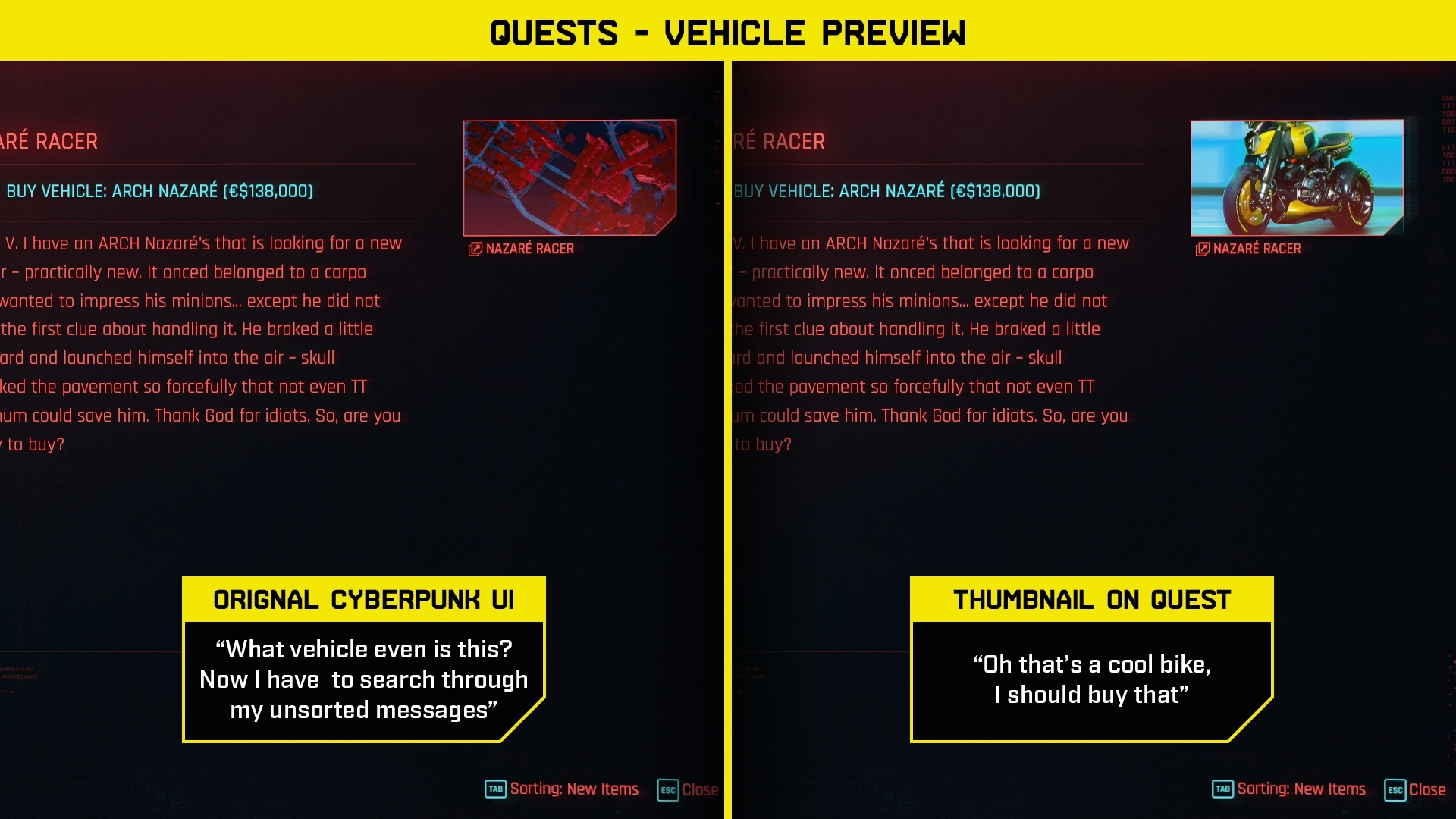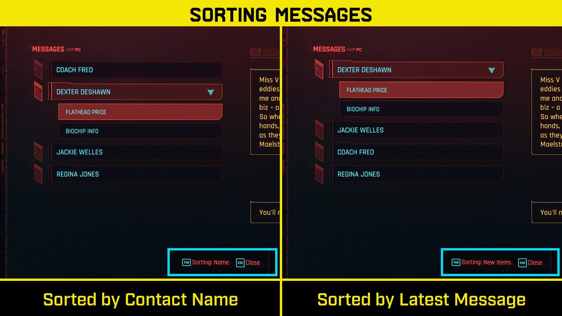 Introduction:A collection of UI improvements. Sort your tasks, messages, and fragments.Author: flibInstall:Need redscriptUnzip the zip file to the Cyberpunk 2077 installation folder