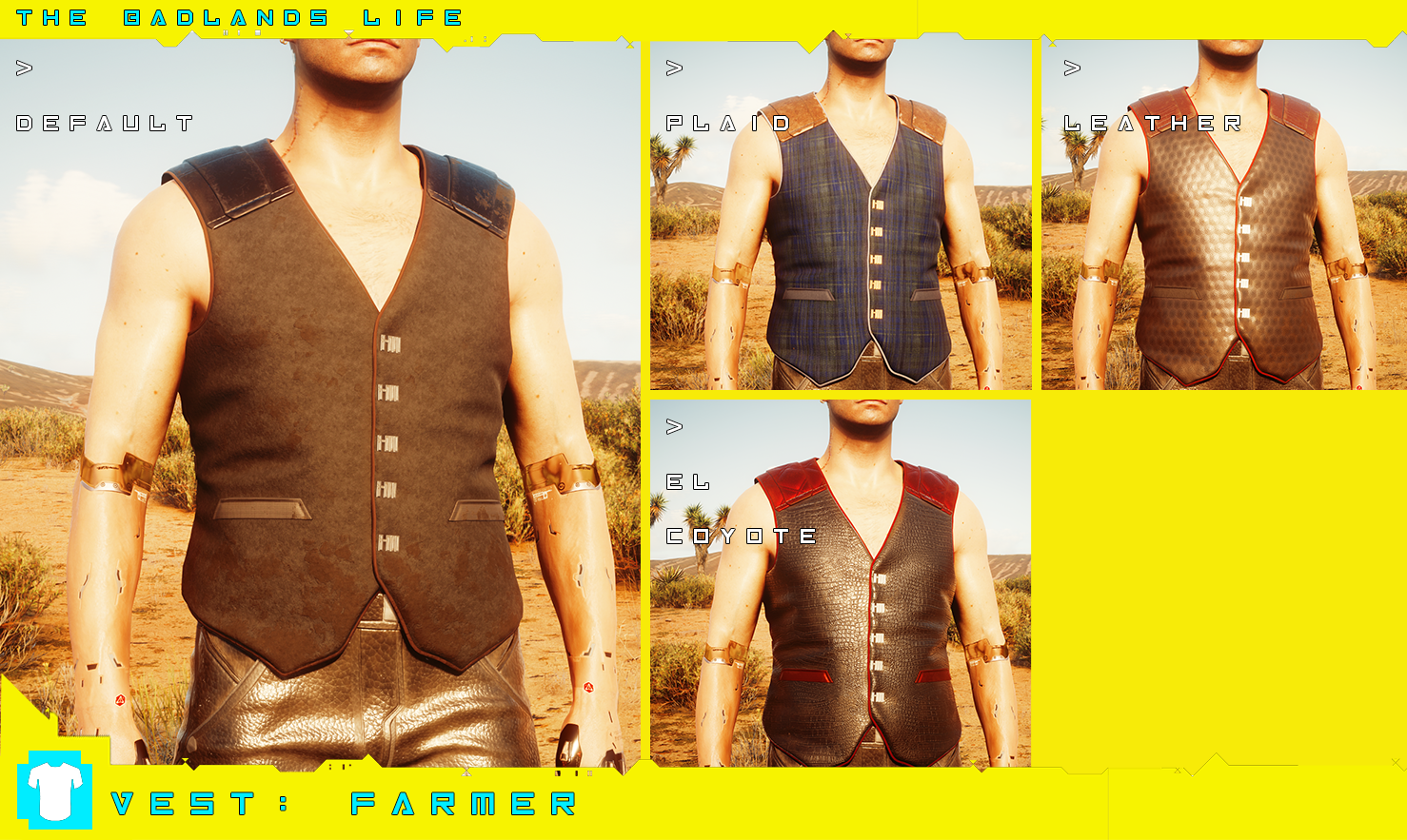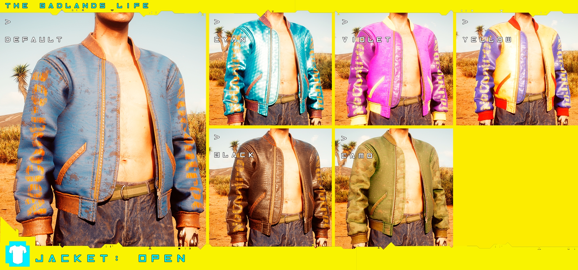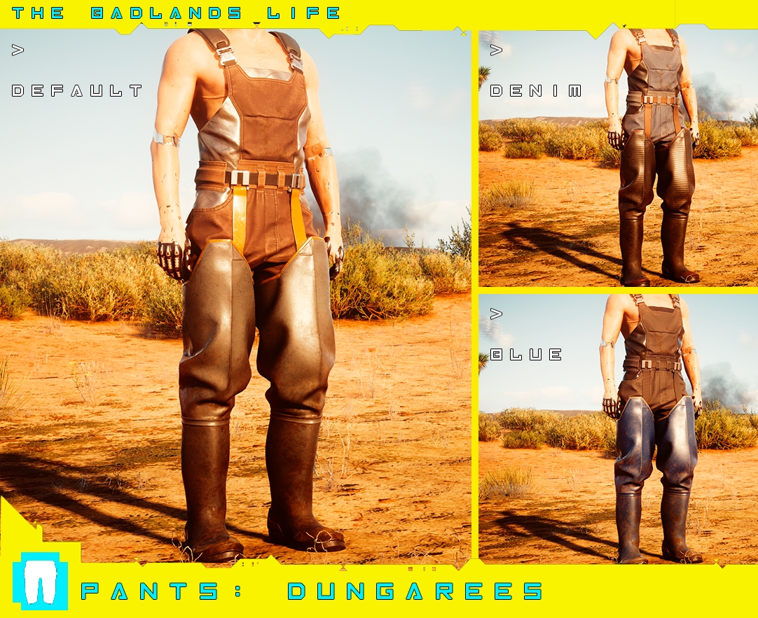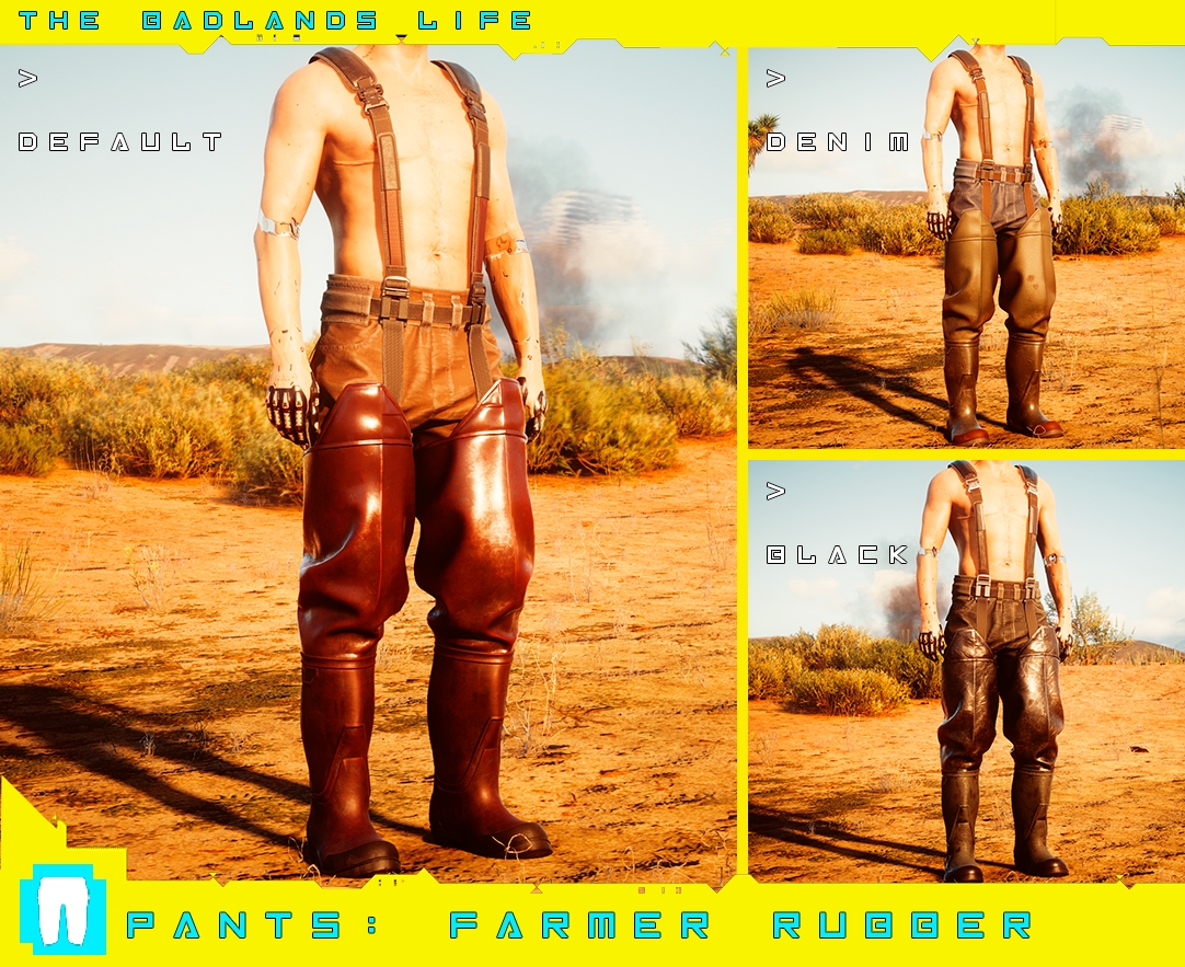 Introduction:Clothes and accessories from the wasteland! Male V only.Author: PinkyDudeInstall:The path of the mod folder is... \ Cyberpunk 2077 \ archive \ pc \ mod If it does not exist, create a mod folder.Steam:\SteamLibrary\steamapps\common\Cyberpunk 2077\archive\pc\modGOG:\GOGLibrary\Games\Cyberpunk 2077\archive\pc\modEpic:\EpicLibrary\Cyberpunk 2077\archive\pc\modNeed Cyber Engine Tweaks