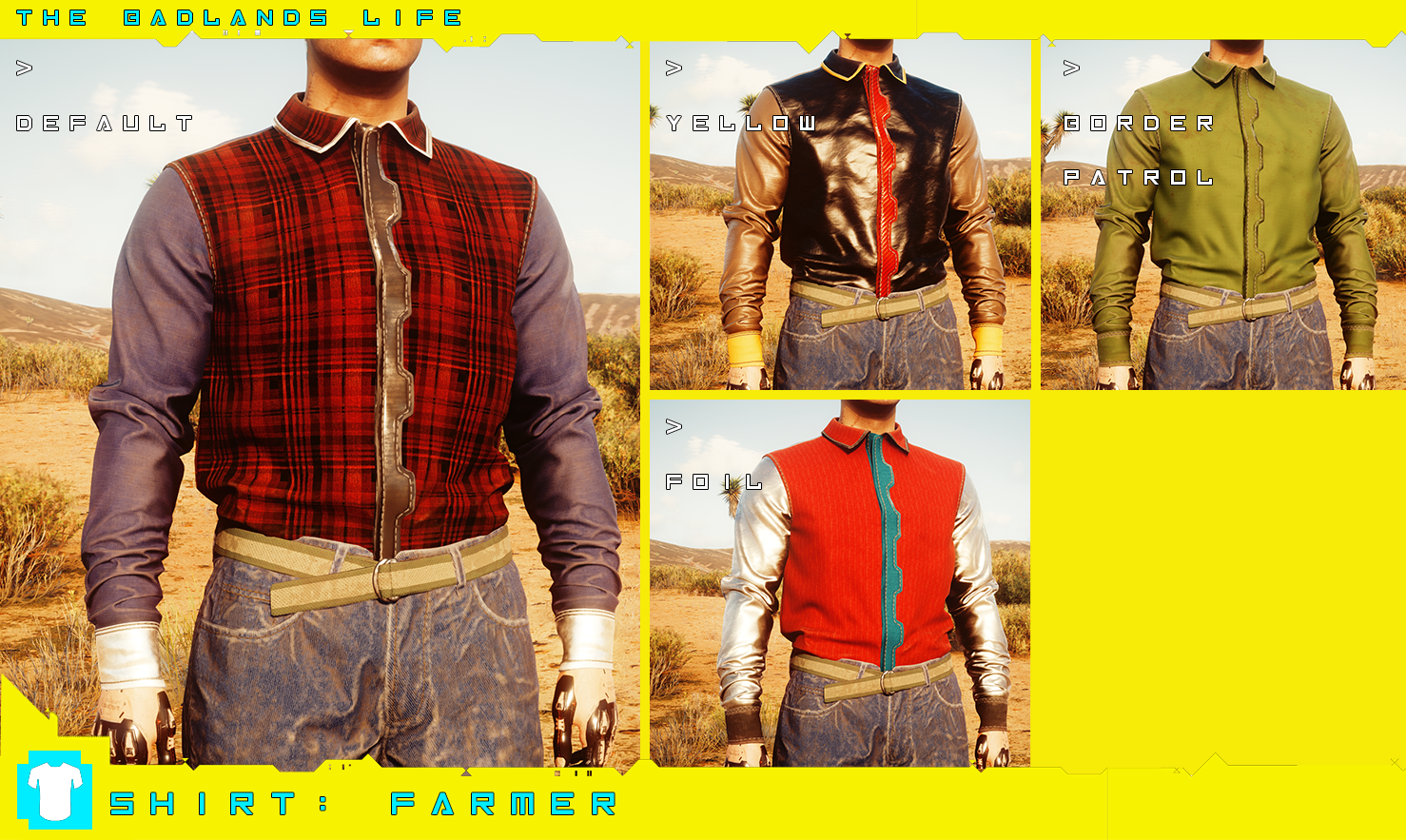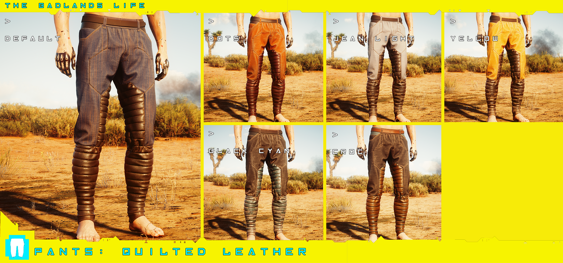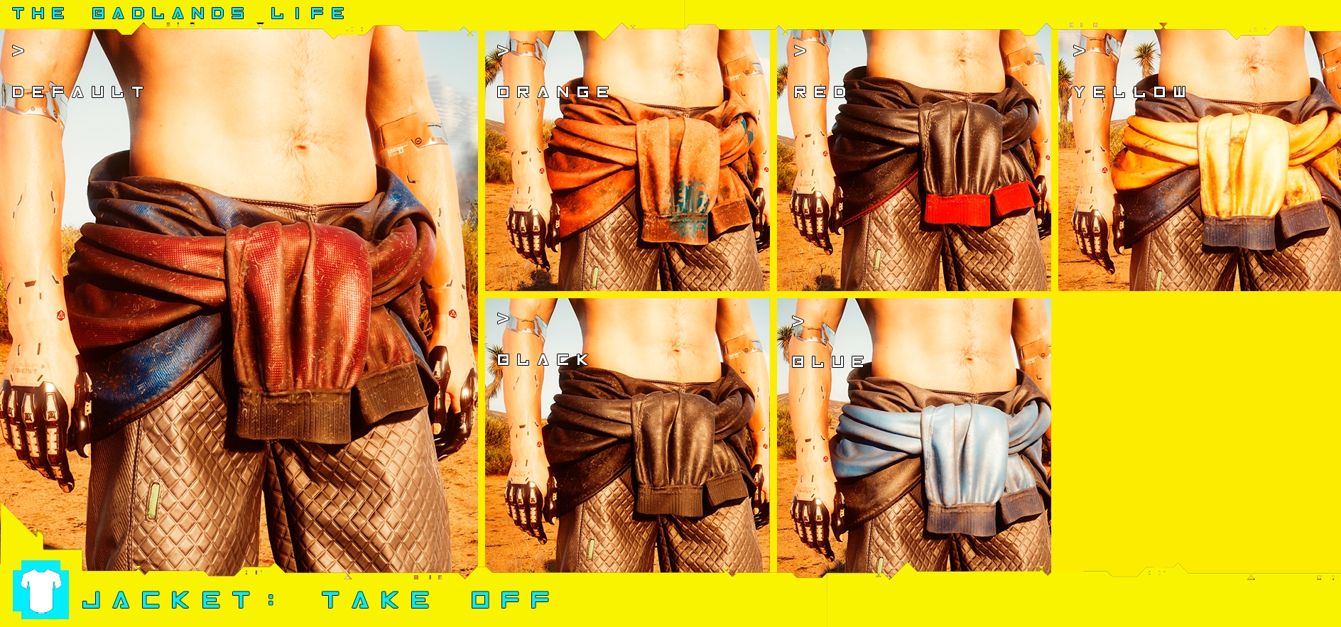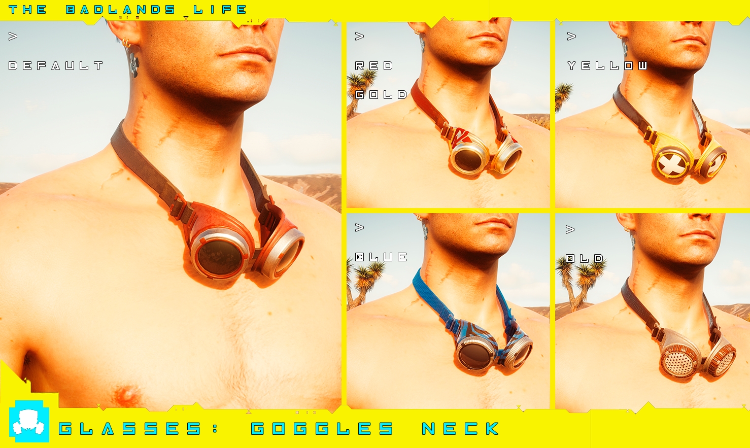 Introduction:Clothes and accessories from the wasteland! Male V only.Author: PinkyDudeInstall:The path of the mod folder is... \ Cyberpunk 2077 \ archive \ pc \ mod If it does not exist, create a mod folder.Steam:\SteamLibrary\steamapps\common\Cyberpunk 2077\archive\pc\modGOG:\GOGLibrary\Games\Cyberpunk 2077\archive\pc\modEpic:\EpicLibrary\Cyberpunk 2077\archive\pc\modNeed Cyber Engine Tweaks