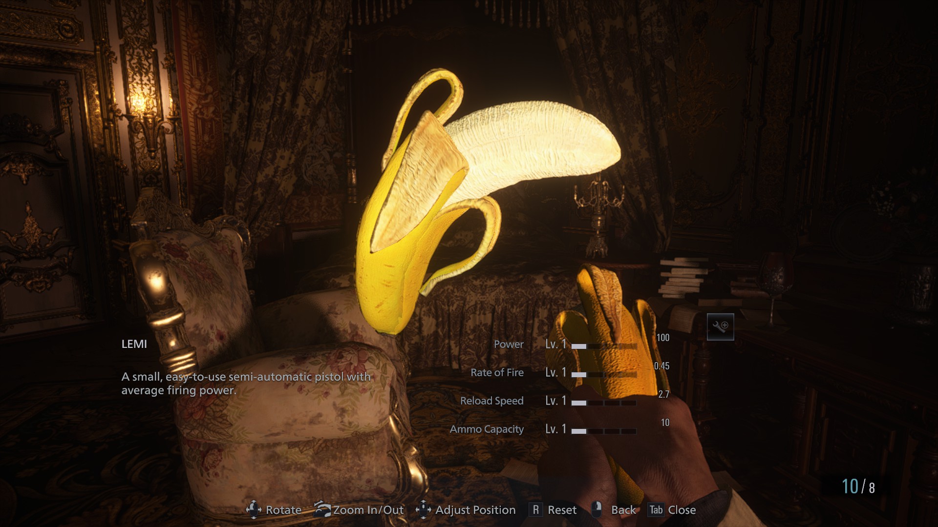 Introduction:Use spoons and bananas instead of knives and pistols!Author: EvilLord aka Stevebg23Install:Install Fluffyquack's Mod ManagerDownload the MOD fileUnzip the fileSave the decompressed file to the ModManager \ Games \ RE8 \ Mods directory and activate the mod.
