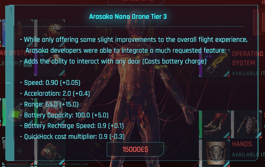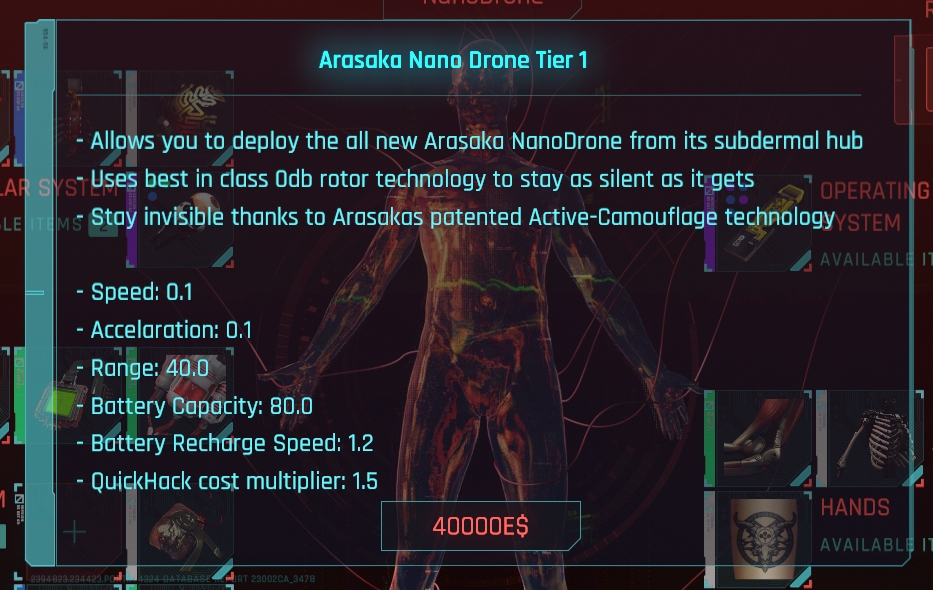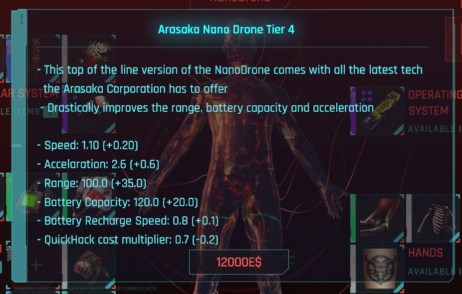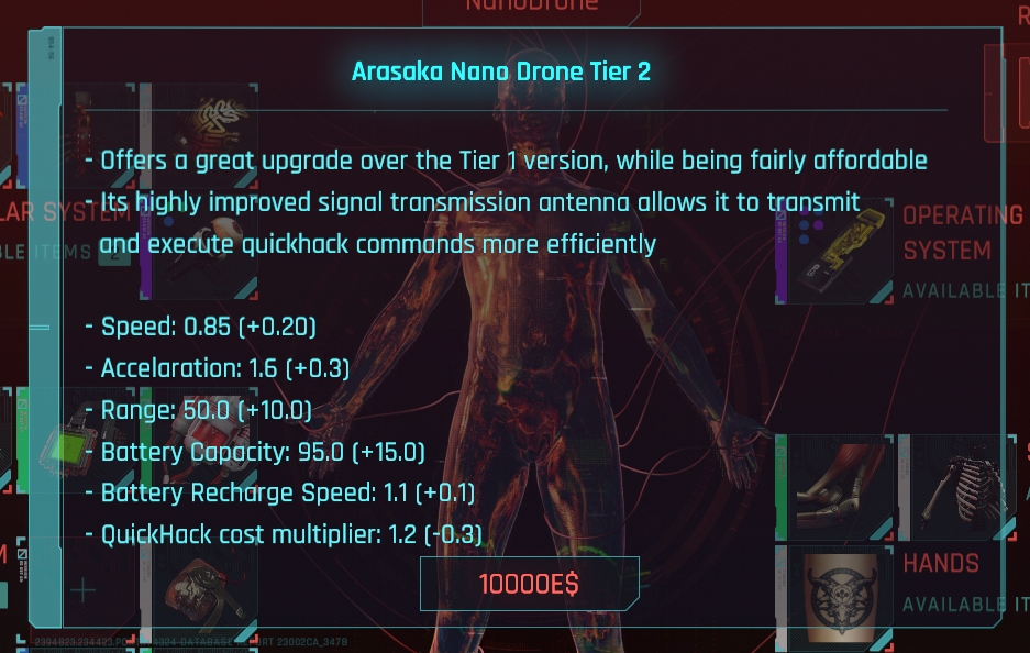 Introduction:This module adds purchases, upgrades, and available nano drones to the game, which can be used for reconnaissance areas and for offensive purposes.Author: keanuWheezeInstall:Download and install CETDownload this moduleUnzip the mod's folder to your Cyberpunk Game folder (the folder containing /bin and /r6)The folder structure should be "PATHTOCYBERPUNK\Cyberpunk2077\bin\x64\plugins\cyber_engine_tweaks\mods\nanoDrone\init.lua"Important note: make sure to set the move key (WASD, up/down) in the CET input tabTo purchase a drone, visit any ripperdoc in the game world and open their shop window as usual. Click the "NanoDrone" button on the player's head to open the purchase window. (Purchase and save files are stored together)After purchasing the Tier 1 version, you can repeat the above process to upgrade your drone to Tier 4The images of all 4 layers of statistics can be found in the image section of this mod pageAfter purchasing the drone, press and hold "Quick Melee" (Q) to deploy the drone (at least 20% battery power required)Press "C" to recall the drone. After being recalled, it will start charging the batteryUse the input keys you previously set to control the droneUse scan mode (Tab key, like the usual kiroshi eye scanner) to mark and unencrypted objects / NPCThe third layer of the drone unlocks the ability to open the door (the basic battery cost of a normal door is 8%, and a locked door is 30%)The cost of each hacking operation (fast hacking and door interaction) using drones is the basic cost (fast hacking RAM) multiplied by the fast hacking cost multiplier (higher drone grade: lower cost)When it exceeds the range of the drone (higher drone level: higher range), it will be automatically recalled after 5 seconds