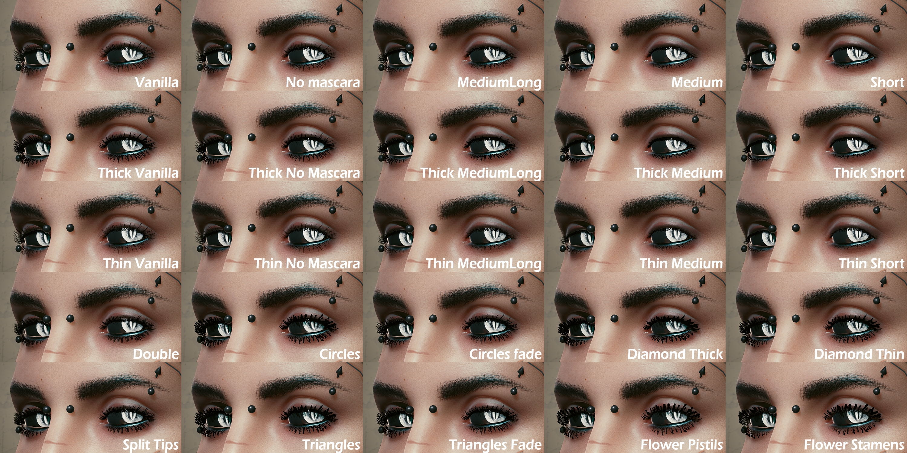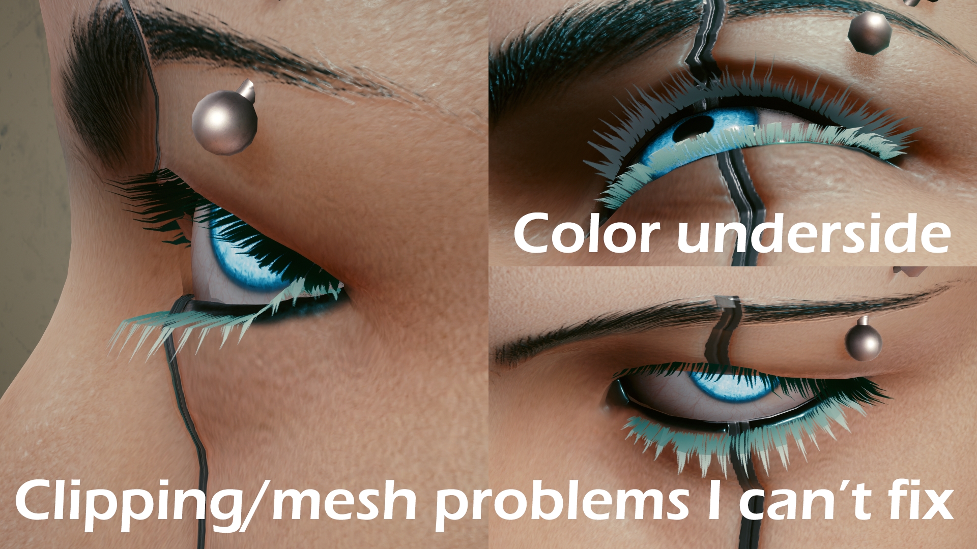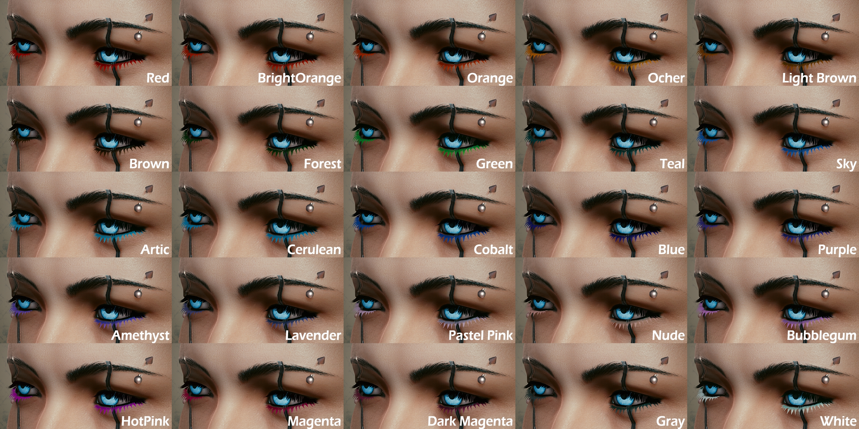 Introduction:There are also color options for female and male V eyelash options.Author: AnruiMurasakiInstall:The path of the mod folder is... \ Cyberpunk 2077 \ archive \ pc \ mod If it does not exist, create a mod folder.Steam:\SteamLibrary\steamapps\common\Cyberpunk 2077\archive\pc\modGOG:\GOGLibrary\Games\Cyberpunk 2077\archive\pc\modEpic:\EpicLibrary\Cyberpunk 2077\archive\pc\modNeed Cyber Engine Tweaks