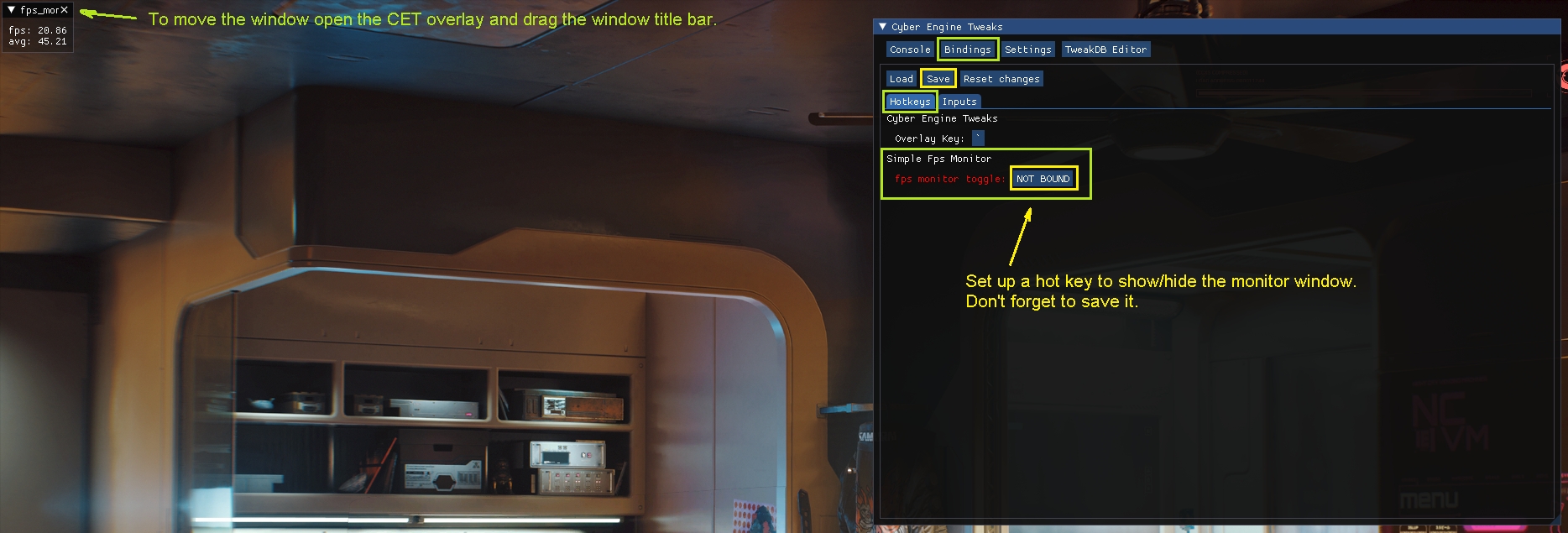 Introduction:Simple display of current and average frame rate per second values.Author: anygoodnameInstall:Navigate to your main game installation folder:Steam: \SteamLibrary\steamapps\common\Cyberpunk 2077\GOG: \GOGLibrary\Games\Cyberpunk 2077\EpicGames: \EpicLibrary\Cyberpunk 2077\and copy everything in the archive file in this folder.Requires Cyber Engine Tweaks