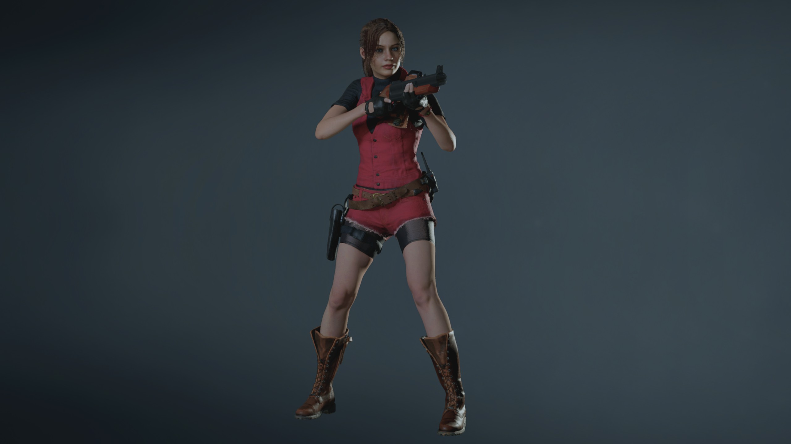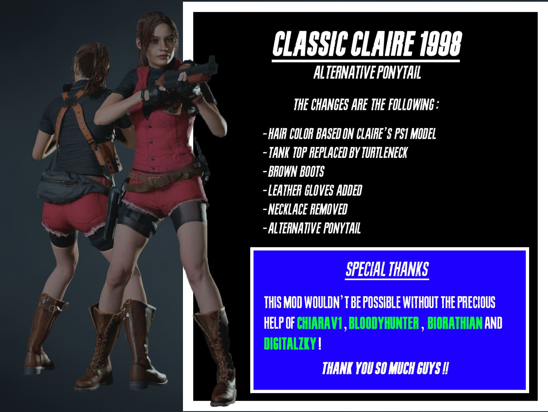 Claire Classics 1998: Modifications make Claire's classic outfits more faithfulTrue to the original version in RE2 (1998), with an alternate ponytail.- Hair color based on Claire's ps1 model- The vest was replaced by a turtleneck- brown boots- Added leather gloves- Necklace removed- Alternative (classic) ponytail