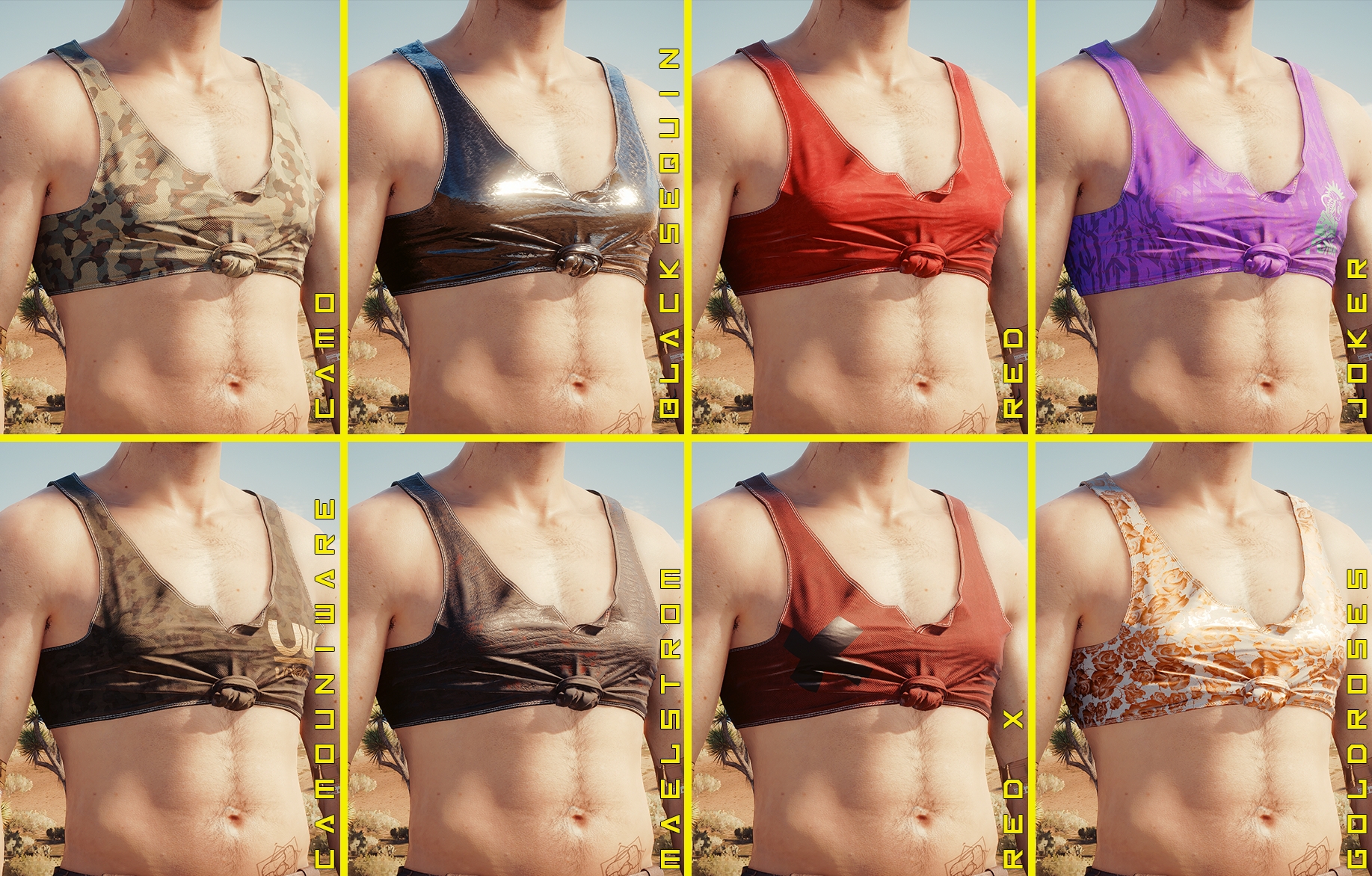 Introduction:Judy's Tank Top for Men VCode: Game.AddToInventory("Items.Undershirt_02_basic_01", 01)Author: PinkyDudeInstall:The path to the mod folder is...\Cyberpunk 2077\archive\pc\mod Create the mod folder if it doesn't exist.Steam:\SteamLibrary\steamapps\common\Cyberpunk 2077\archive\pc\modGOG:\GOGLibrary\Games\Cyberpunk 2077\archive\pc\modEpic:\EpicLibrary\Cyberpunk 2077\archive\pc\modRequires Cyber Engine Tweaks