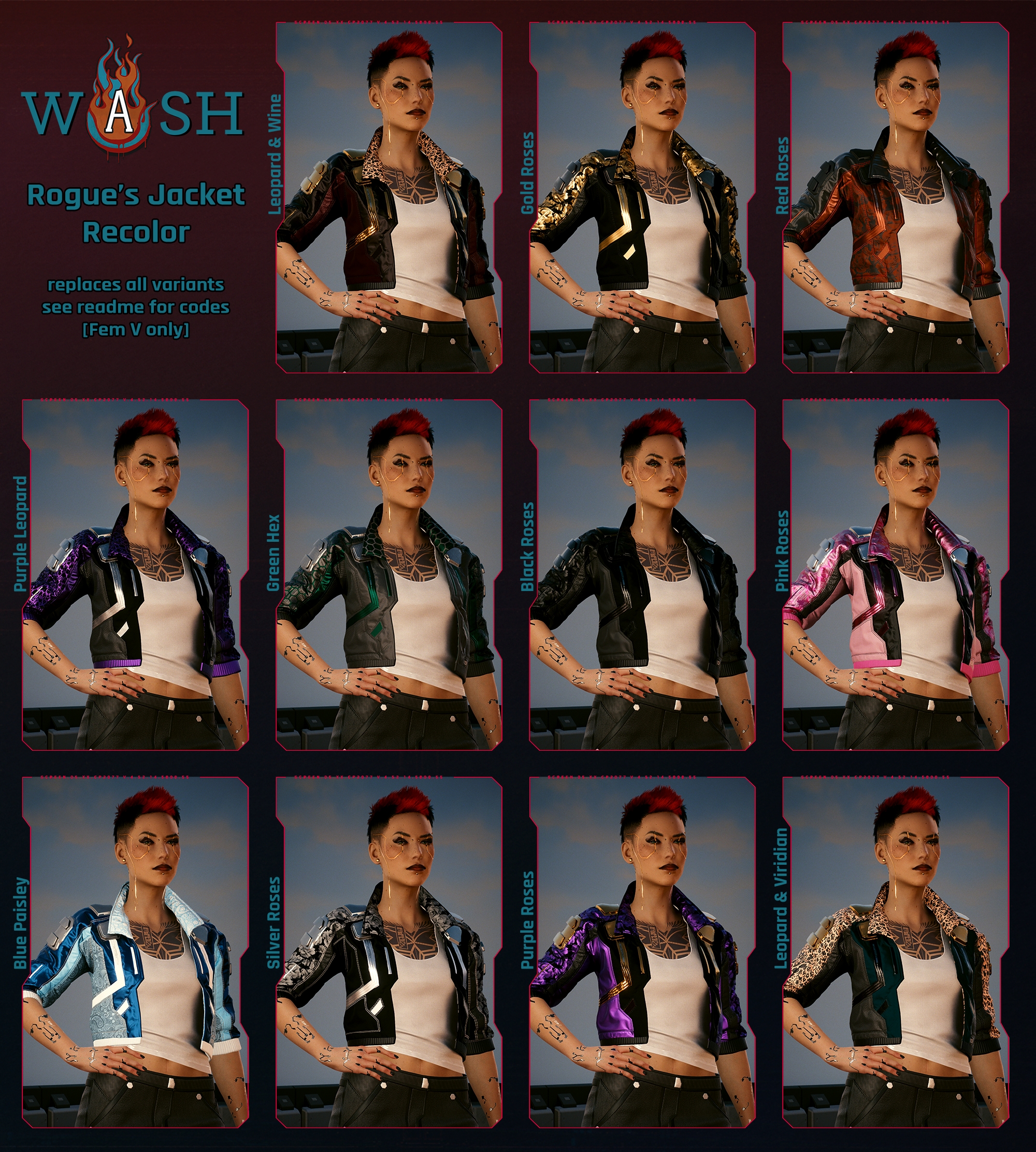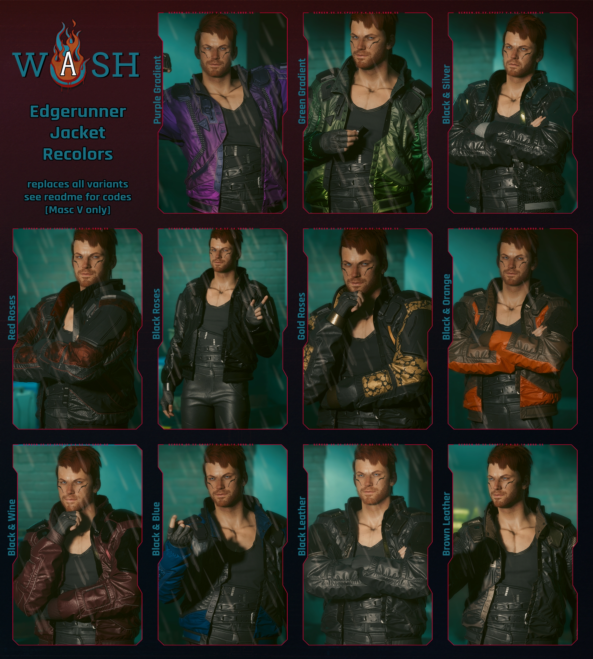 Introduction:Recolor edgerunner jacket for fem and masc V.Author: washInstall:The path to the mod folder is...\Cyberpunk 2077\archive\pc\mod Create the mod folder if it doesn't exist.Steam:\SteamLibrary\steamapps\common\Cyberpunk 2077\archive\pc\modGOG:\GOGLibrary\Games\Cyberpunk 2077\archive\pc\modEpic:\EpicLibrary\Cyberpunk 2077\archive\pc\modRequires Cyber Engine Tweaks
