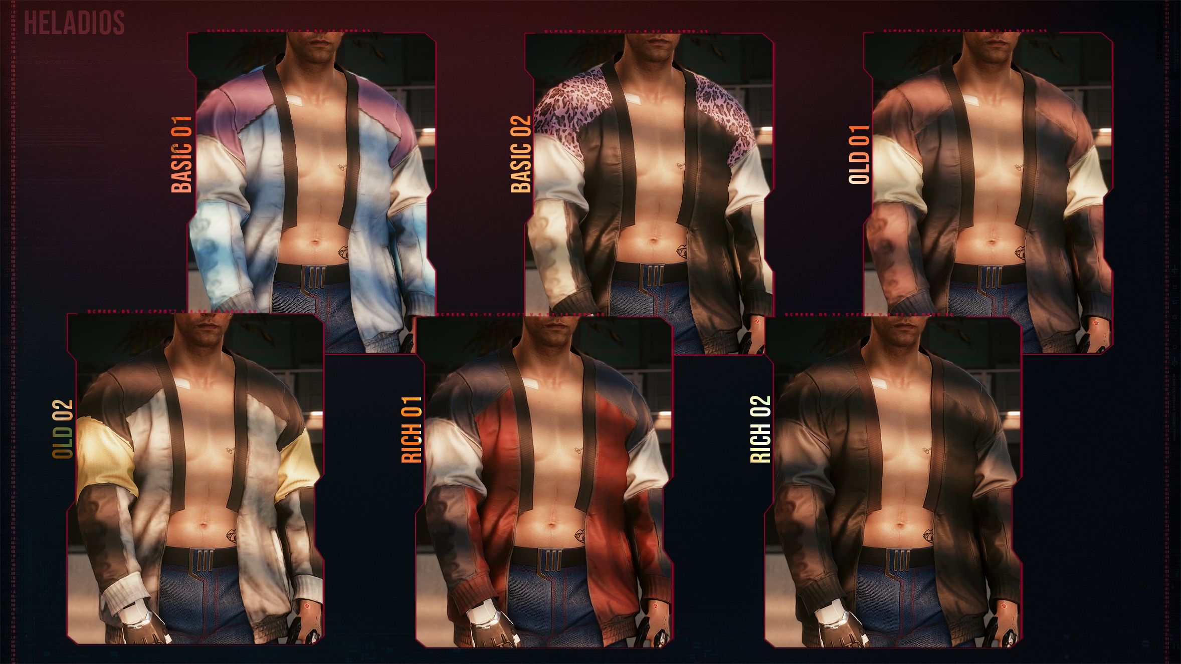 Introduction:Asian Jacket Modification (Male V)Author: heladiosInstall:The path to the mod folder is...\Cyberpunk 2077\archive\pc\mod Create the mod folder if it doesn't exist.Steam:\SteamLibrary\steamapps\common\Cyberpunk 2077\archive\pc\modGOG:\GOGLibrary\Games\Cyberpunk 2077\archive\pc\modEpic:\EpicLibrary\Cyberpunk 2077\archive\pc\mod
