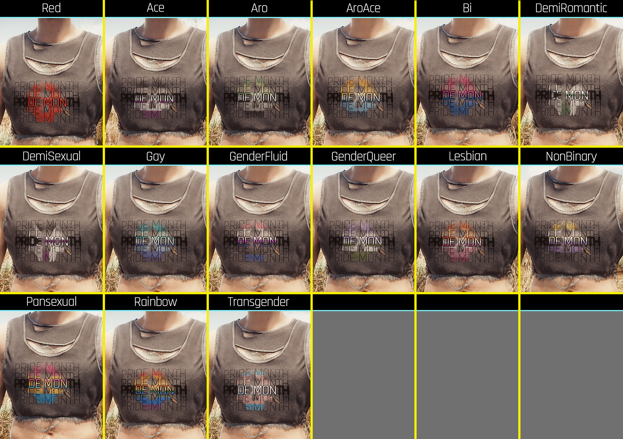 Introduction:Short frayed vest from Masc and Fem V! Includes version with decalsCode:Game.AddToInventory("Items.TShirt_01_basic_01",01)Game.AddToInventory("Items.Undershirt_03_basic_01",01)Author: PinkyDudeInstall:The path to the mod folder is...\Cyberpunk 2077\archive\pc\mod Create the mod folder if it doesn't exist.Steam:\SteamLibrary\steamapps\common\Cyberpunk 2077\archive\pc\modGOG:\GOGLibrary\Games\Cyberpunk 2077\archive\pc\modEpic:\EpicLibrary\Cyberpunk 2077\archive\pc\mod