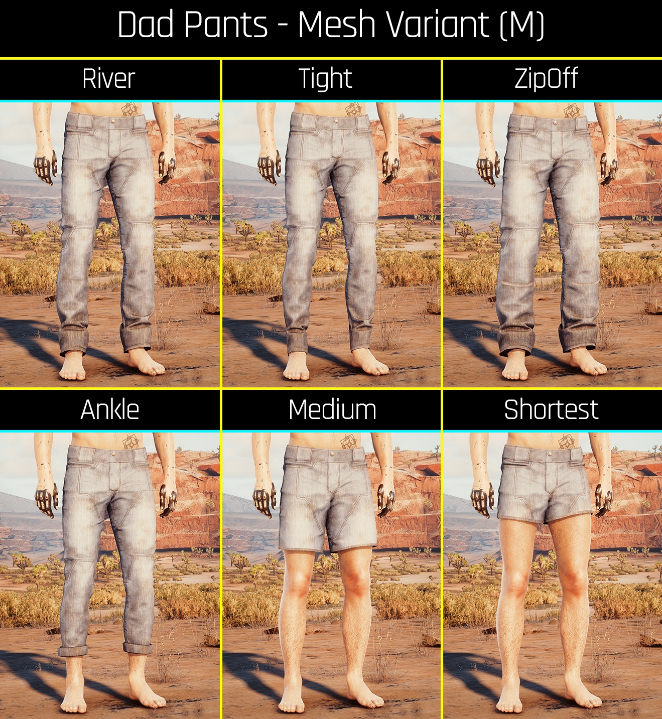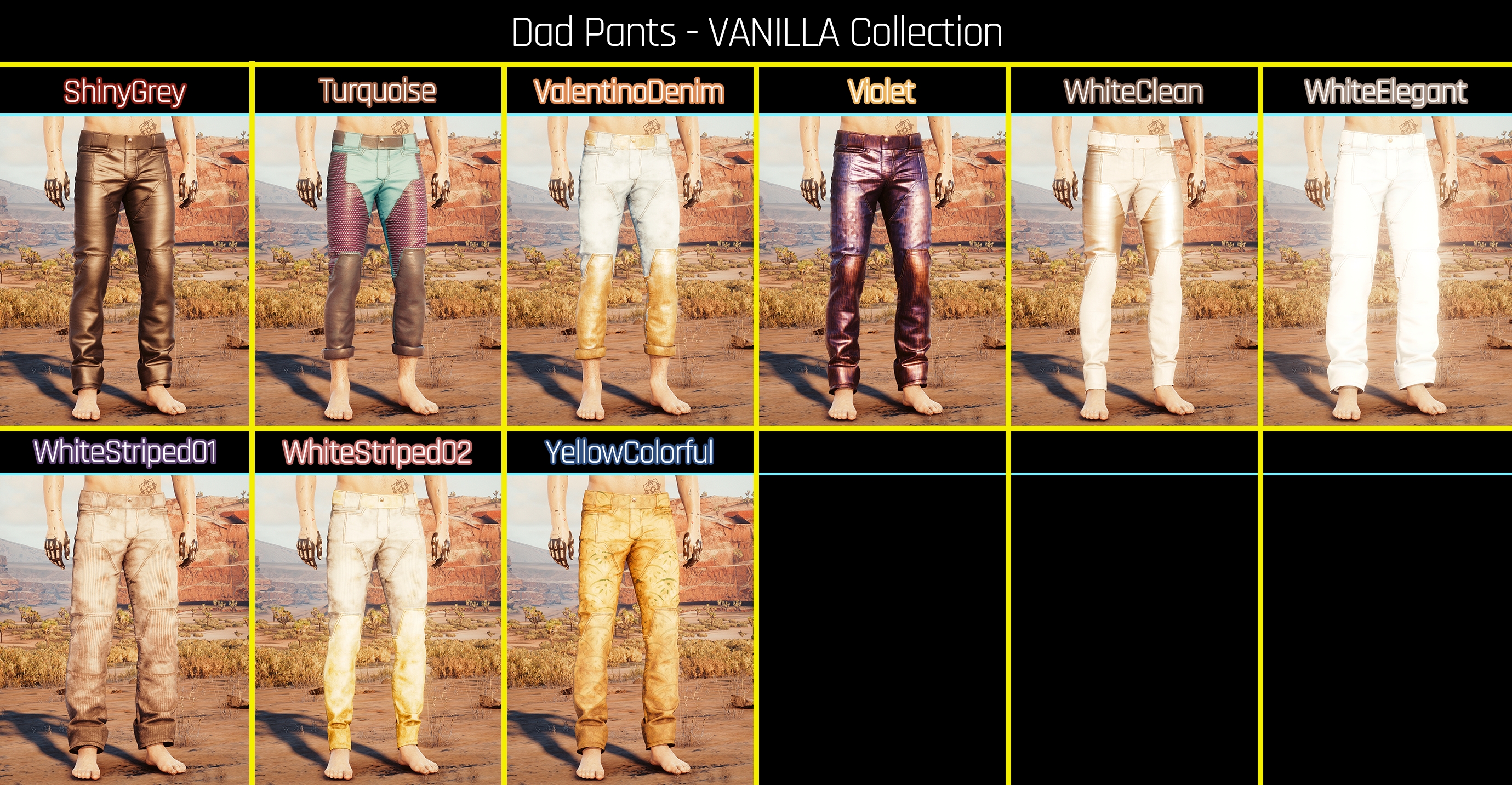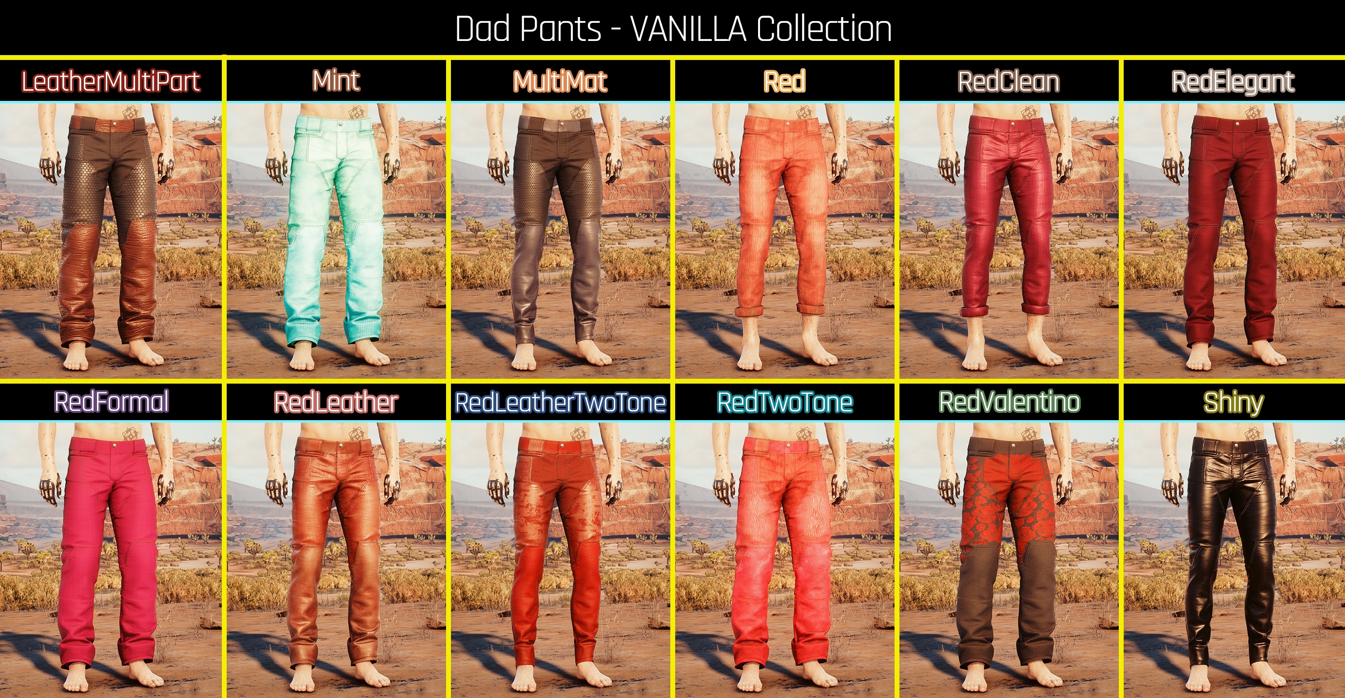Introduction:Fem and Masc V's Funky Dad PantsAuthor: PinkyDudeInstall:The path to the mod folder is...\Cyberpunk 2077\archive\pc\mod Create the mod folder if it doesn't exist.Steam:\SteamLibrary\steamapps\common\Cyberpunk 2077\archive\pc\modGOG:\GOGLibrary\Games\Cyberpunk 2077\archive\pc\modEpic:\EpicLibrary\Cyberpunk 2077\archive\pc\mod