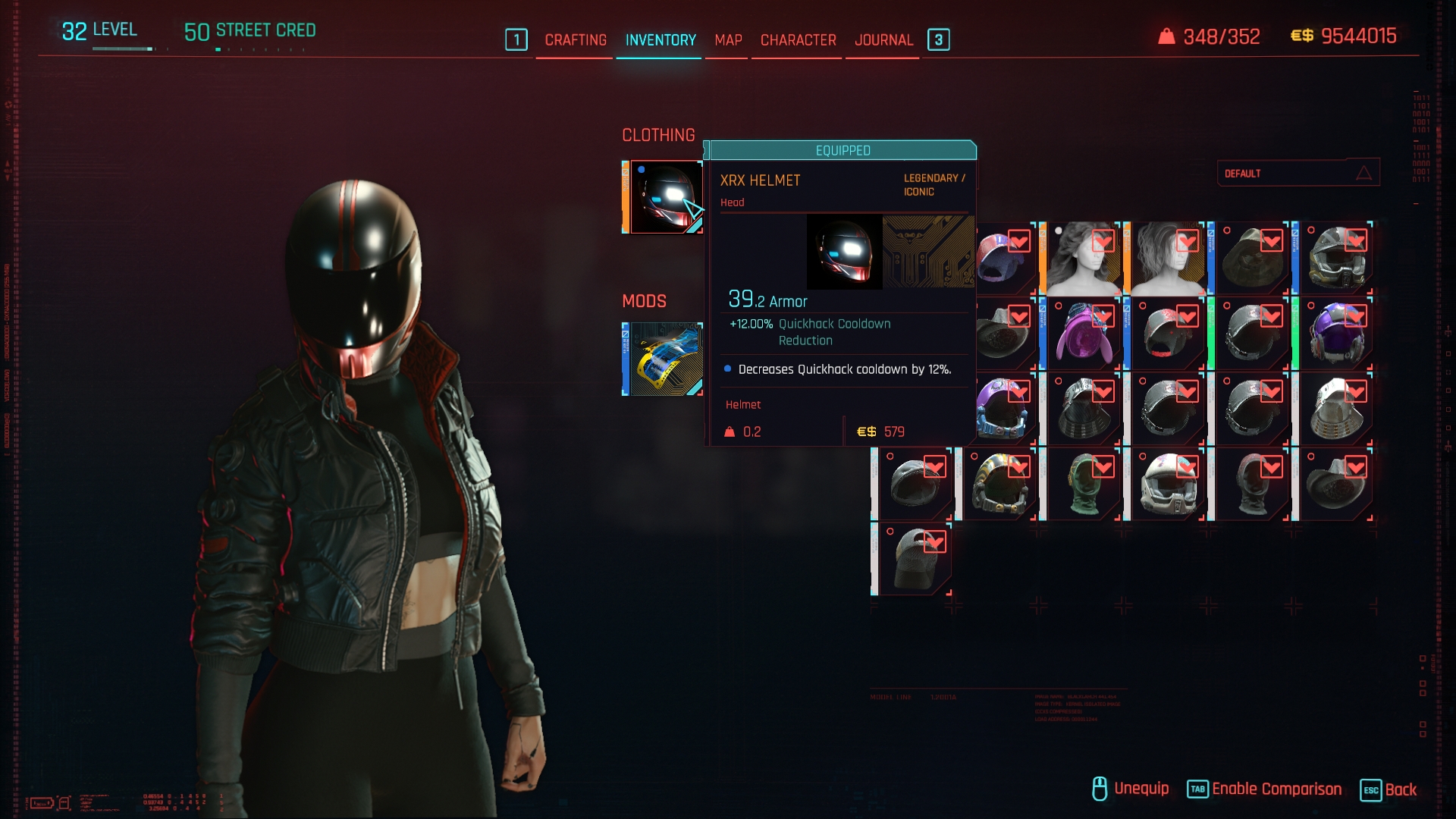 Introduction:XRX Helmet - Archive XL (Female V only)Code: Game.AddToInventory("Items.xrxbiker_xr",1)Author: Ezio MaverickInstall:The path to the mod folder is...\Cyberpunk 2077\archive\pc\mod Create the mod folder if it doesn't exist.Steam:\SteamLibrary\steamapps\common\Cyberpunk 2077\archive\pc\modGOG:\GOGLibrary\Games\Cyberpunk 2077\archive\pc\modEpic:\EpicLibrary\Cyberpunk 2077\archive\pc\modMOD REQUIRED:ArchiveXLCyberpunk 2077 Texture OverrideRED4extTweakXL