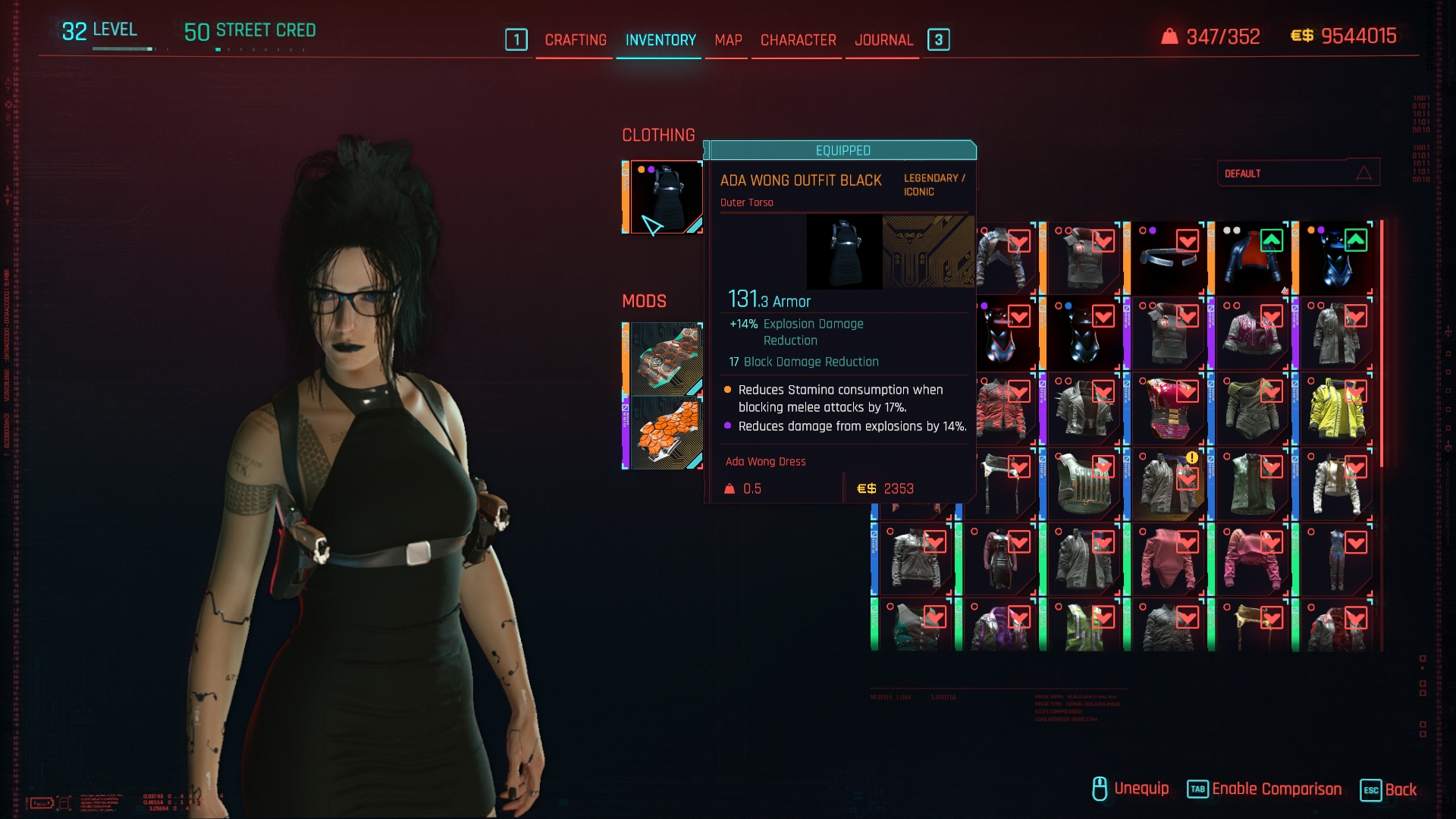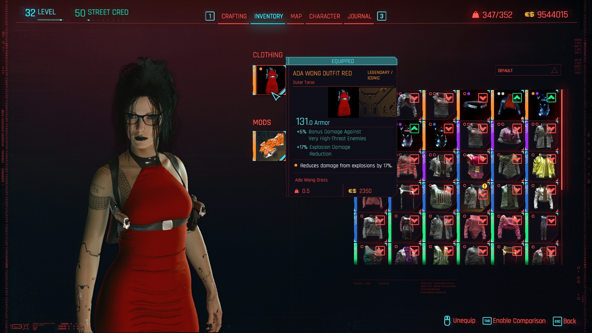 Introduction:Ada Wong Outfit Reworked - Archive XL (Female V Only)Code:Game.AddToInventory("Items.ada_outfit_red",1)Game.AddToInventory("Items.ada_outfit_black",1)Author: Ezio MaverickInstall:The path to the mod folder is...\Cyberpunk 2077\archive\pc\mod Create the mod folder if it doesn't exist.Steam:\SteamLibrary\steamapps\common\Cyberpunk 2077\archive\pc\modGOG:\GOGLibrary\Games\Cyberpunk 2077\archive\pc\modEpic:\EpicLibrary\Cyberpunk 2077\archive\pc\modMOD required:ArchiveXLCyberpunk 2077 Texture OverrideRED4extTweakXL