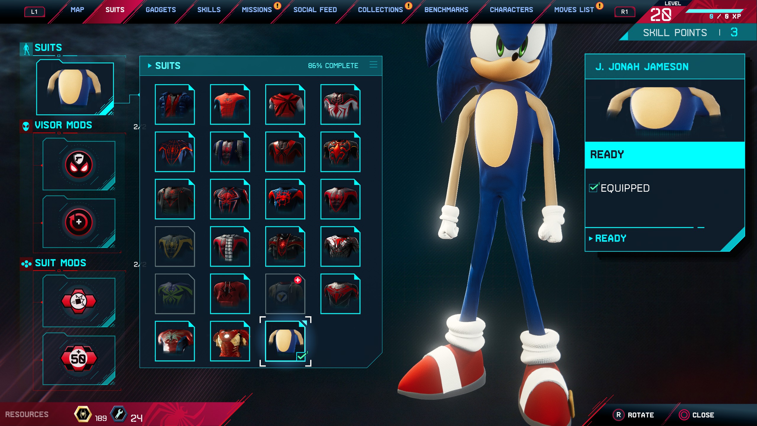 Play as the legendary chilidog eating Hedgehog; adds a suit slot and custom icon.