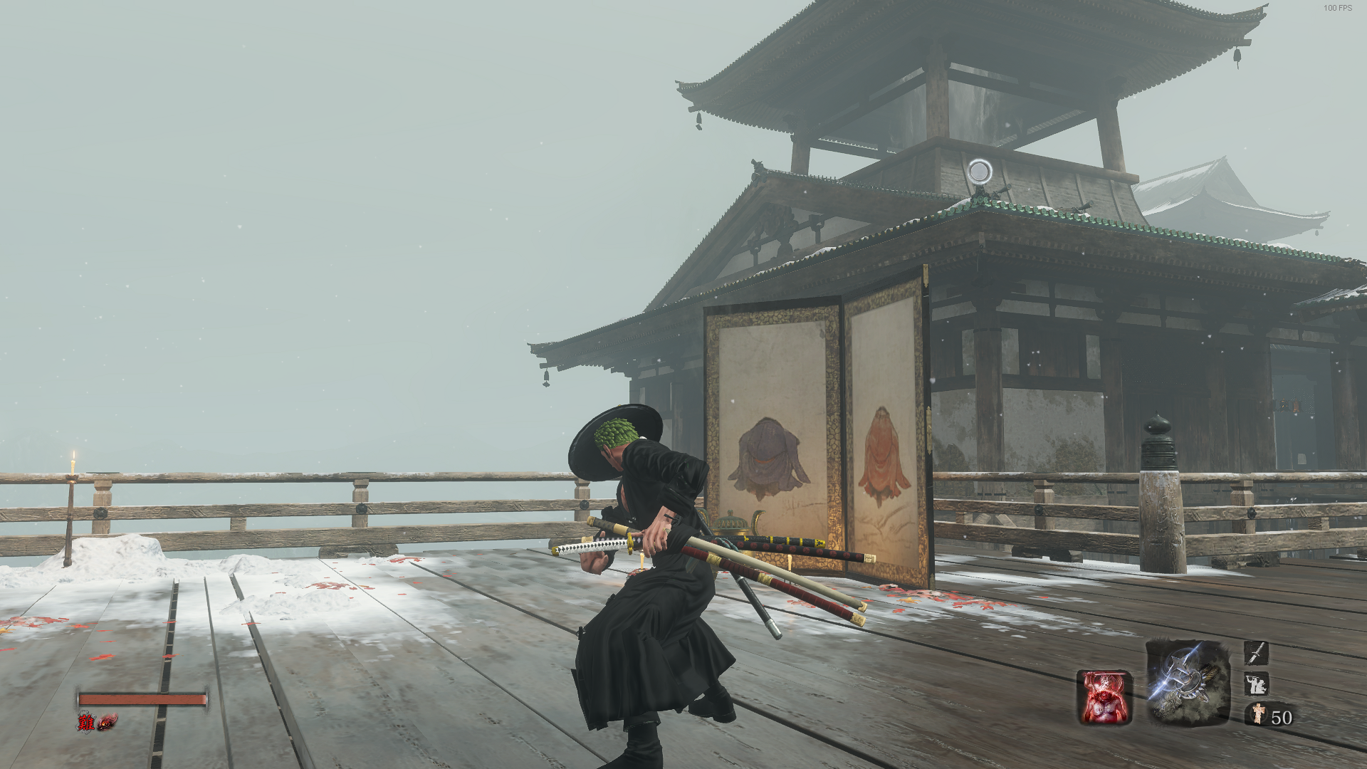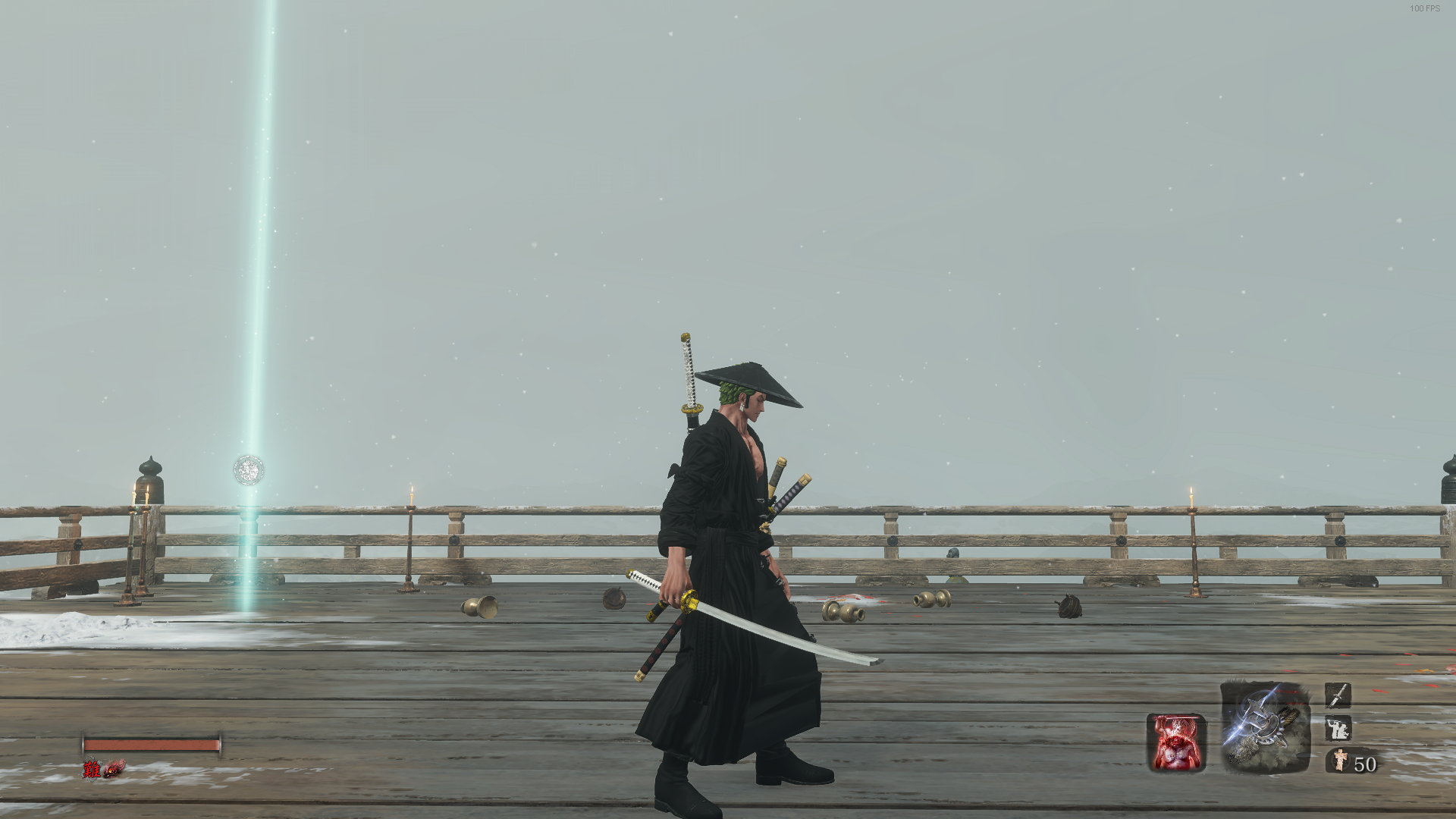 black bamboo hat, black robes, Sekiro's Yamato for Zoro from Jump Force.