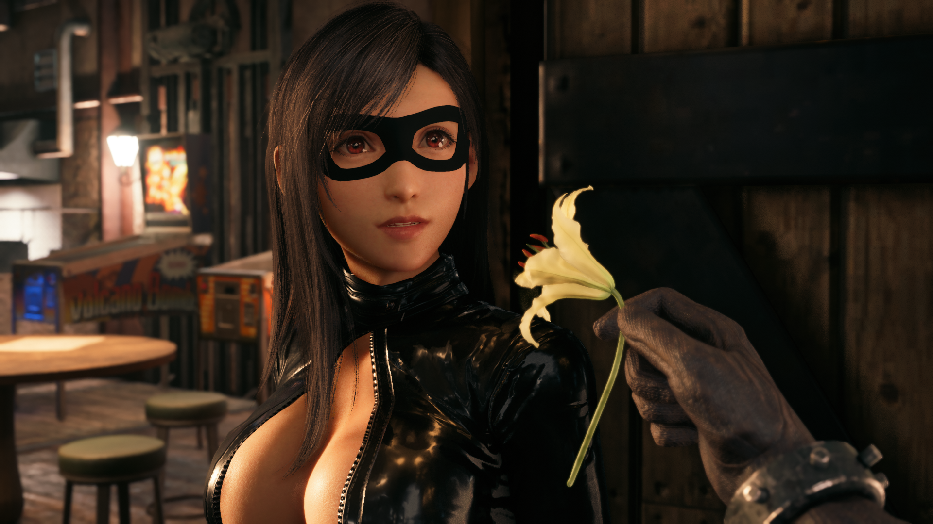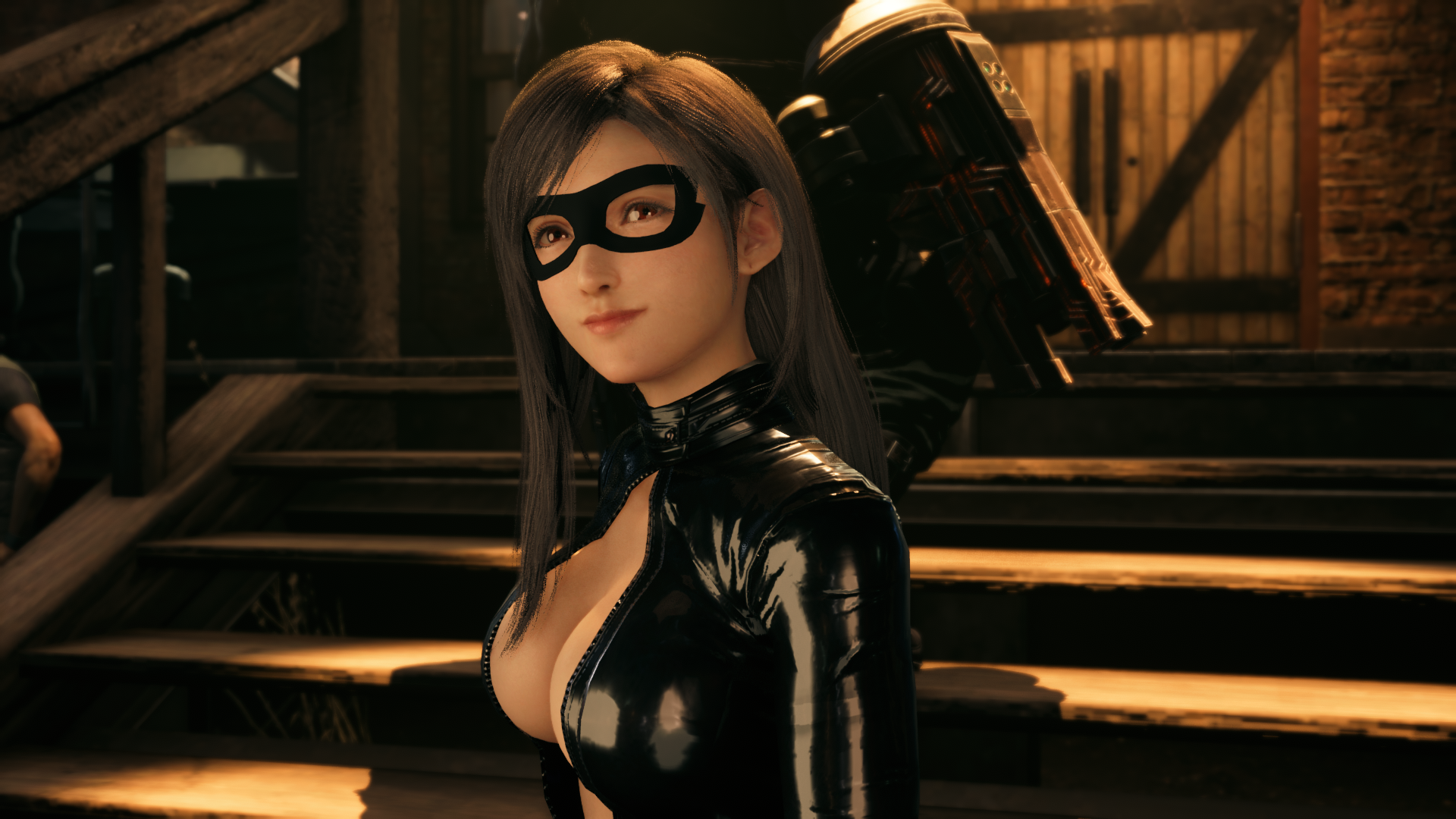 Gives Tifa a black, latex catsuit with matching boots and a domino mask.