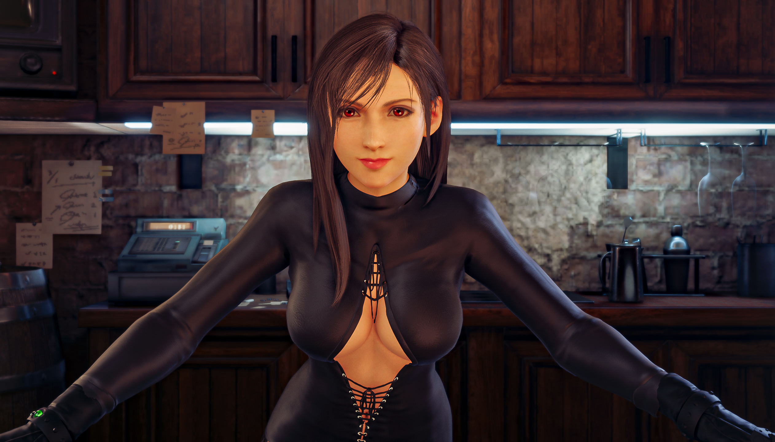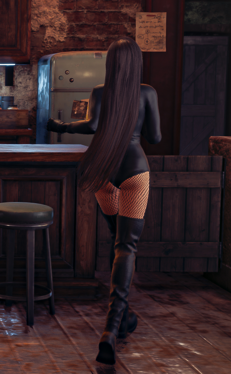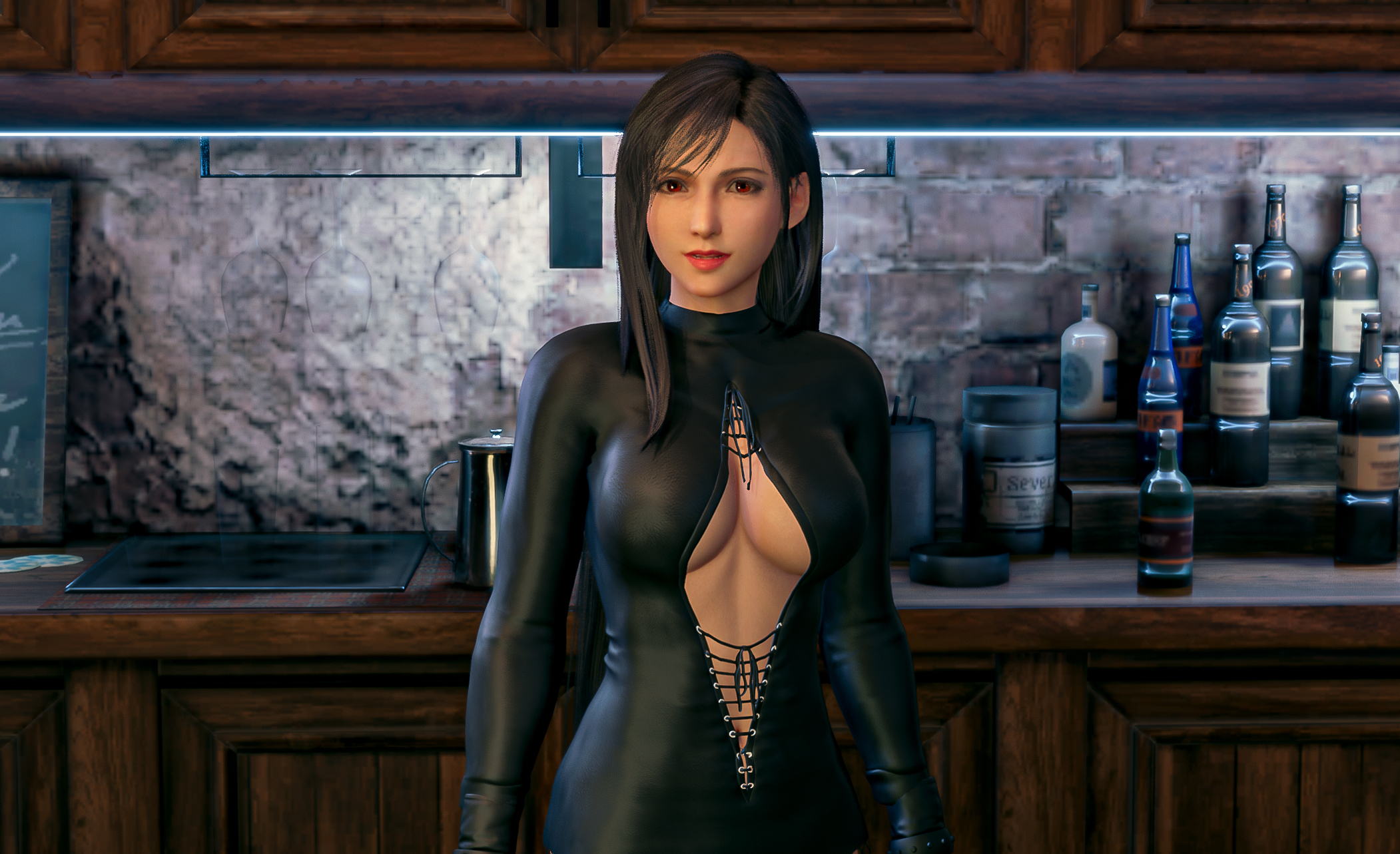 Tifa puts on her Dark Suit in this costume mod. A laced up, leather all in one with net stockings and high leather boots.