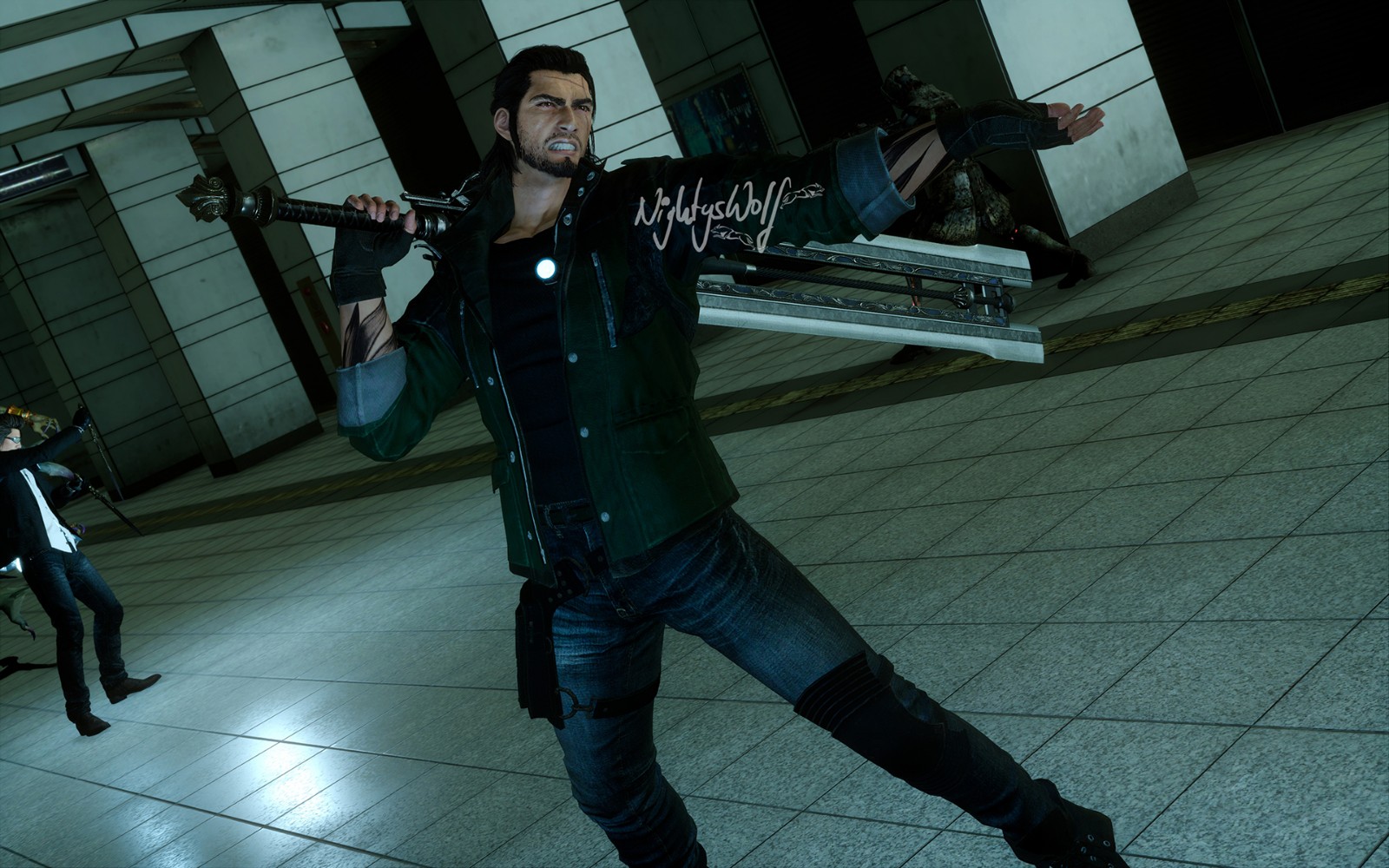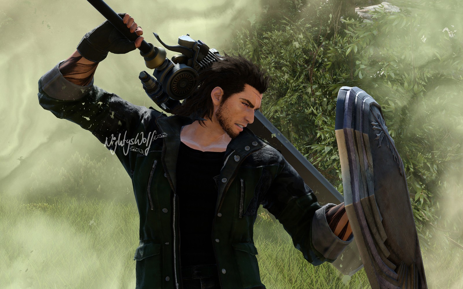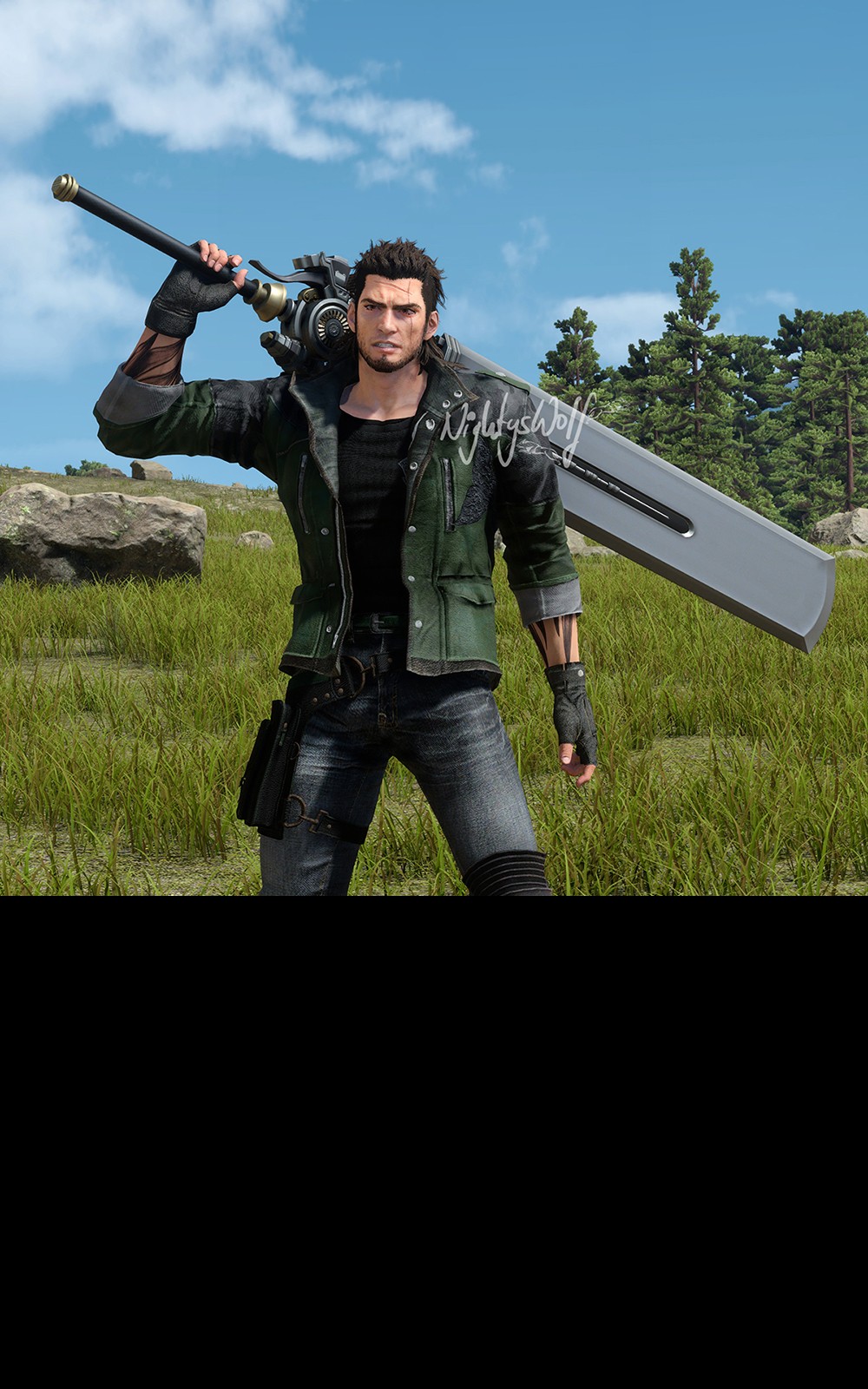 The tribal on Gladio's back is actually Bismark, reaching around the whole jacket. It's just not that visible, but I wanted to use something different than a Behemoth. XD