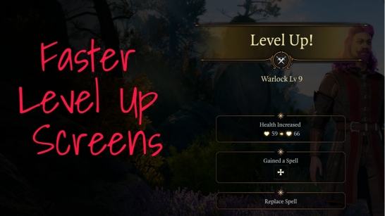This mod speeds up the character level up animations by 2x-4x to save you just that little bit of extra time