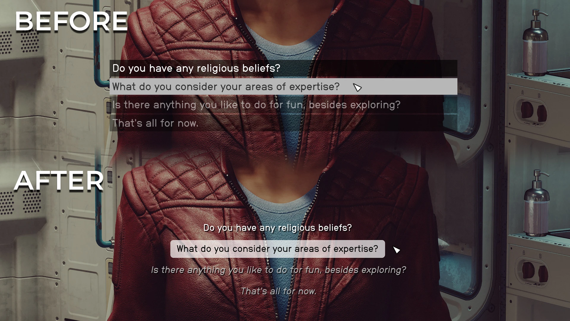 Enhance your dialogue experience with a wider, refined and centered text area, improved text clarity featuring a subtle shadow for better readability.
