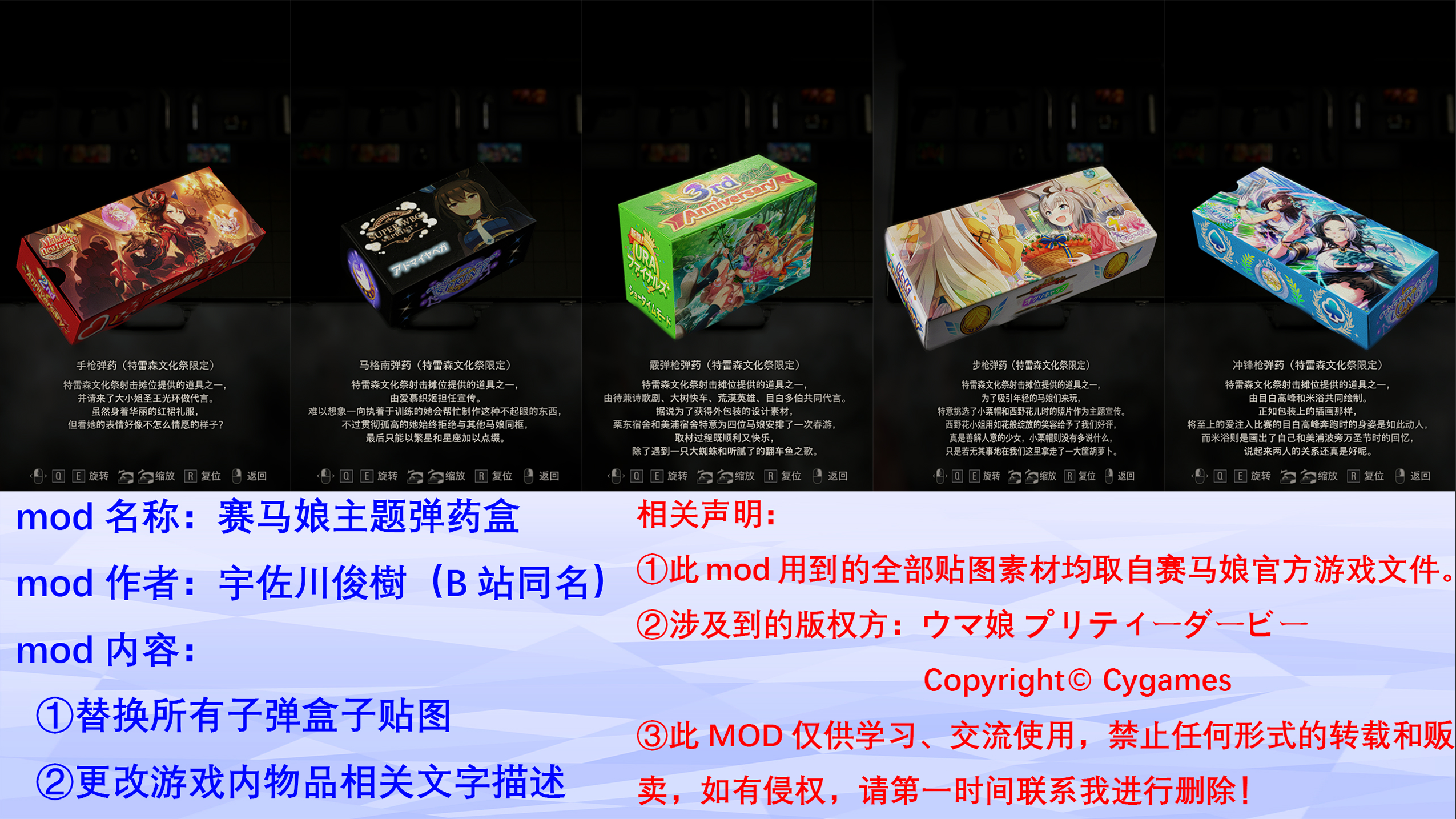 Mod name: Jockey Girl themed ammunition boxMod author: Toshiki Usagawa (same name at station B)Personal homepage: https://space.bilibili.com/23769827The following is the content of the mod:①Replace all bullet box textures②Change text descriptions related to in-game itemsRelated statements:①All the texture materials used in this mod are taken from the official game files of Jockey Girl.②Copyright parties involved: ウマ女プリティーダービー, Copyright© Cygames③This MOD is only for learning and communication. Any form of reprinting and selling is prohibited. If there is any infringement, please contact me as soon as possible to delete it!